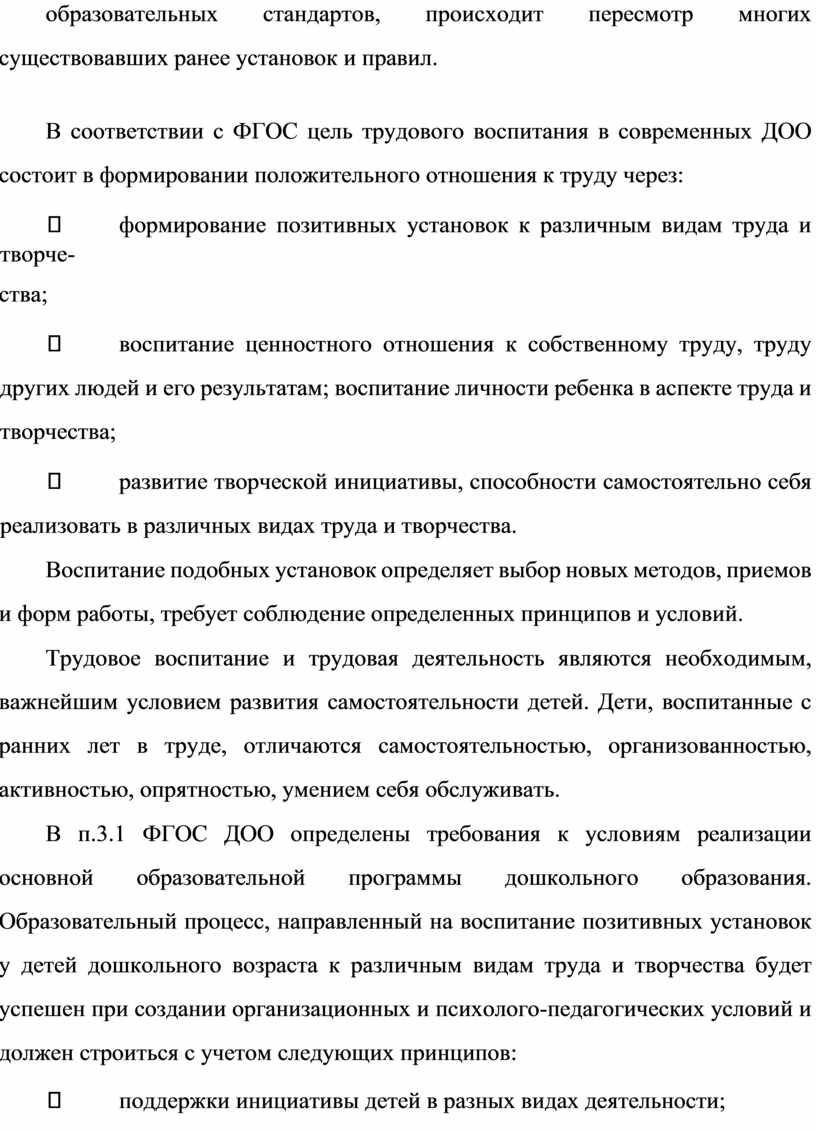 В п.3.1 ФГОС ДОО определены требования к условиям реализации основной образовательной программы дошкольного образования. Образовательный процесс, направленный на воспитание позитивных установок у детей дошкольного возраста к различным видам труда и творчества будет успешен при создании организационных и психолого-педагогических условий и должен строиться с учетом следующих принципов: