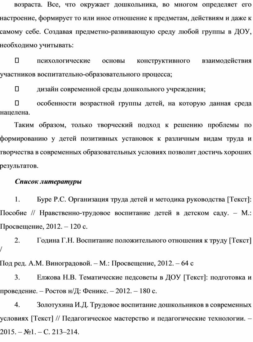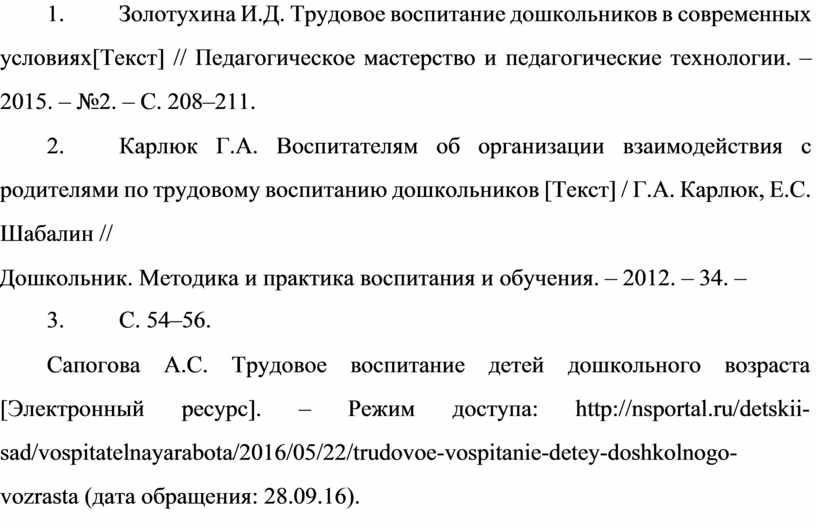 5. Золотухина И.Д. Трудовое воспитание дошкольников в современных условиях[Текст] // Педагогическое мастерство и педагогические технологии. – 2015. – №2. – С. 208–211.