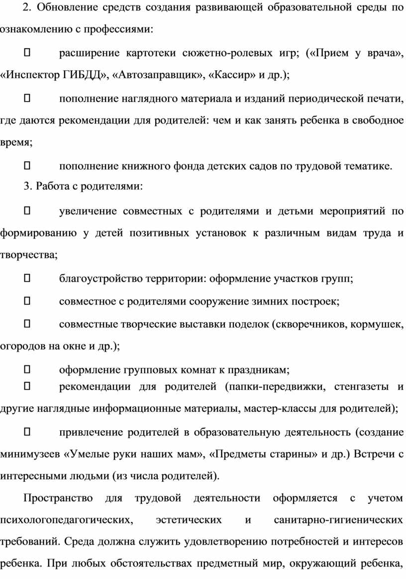 Пространство для трудовой деятельности оформляется с учетом психологопедагогических, эстетических и санитарно-гигиенических требований. Среда должна служить удовлетворению потребностей и интересов ребенка. При любых обстоятельствах предметный мир, окружающий ребенка, необходимо пополнять и обновлять, приспосабливая к новообразованиям определенного возраста. Все, что окружает дошкольника, во многом определяет его настроение, формирует то или иное отношение к предметам, действиям и даже к самому себе. Создавая предметно-развивающую среду любой группы в ДОУ, необходимо учитывать:
