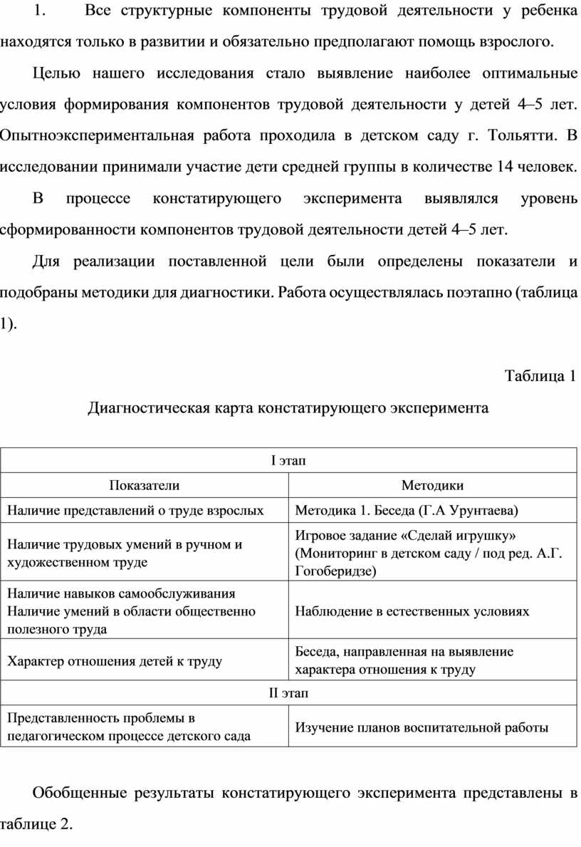 В процессе констатирующего эксперимента выявлялся уровень сформированности компонентов трудовой деятельности детей 4–5 лет.