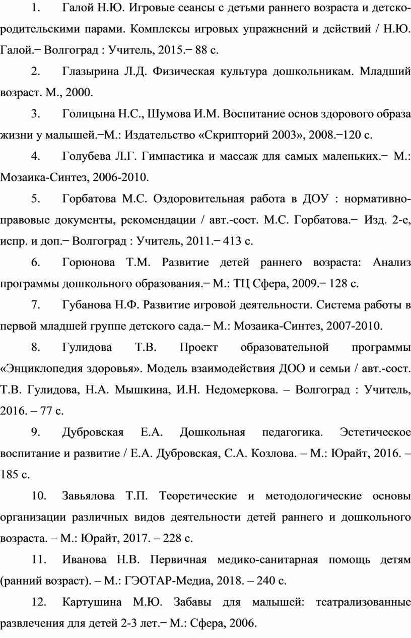 12. Галой Н.Ю. Игровые сеансы с детьми раннего возраста и детско-родительскими парами. Комплексы игровых упражнений и действий / Н.Ю. Галой. ̶ Волгоград : Учитель, 2015. ̶ 88 с.