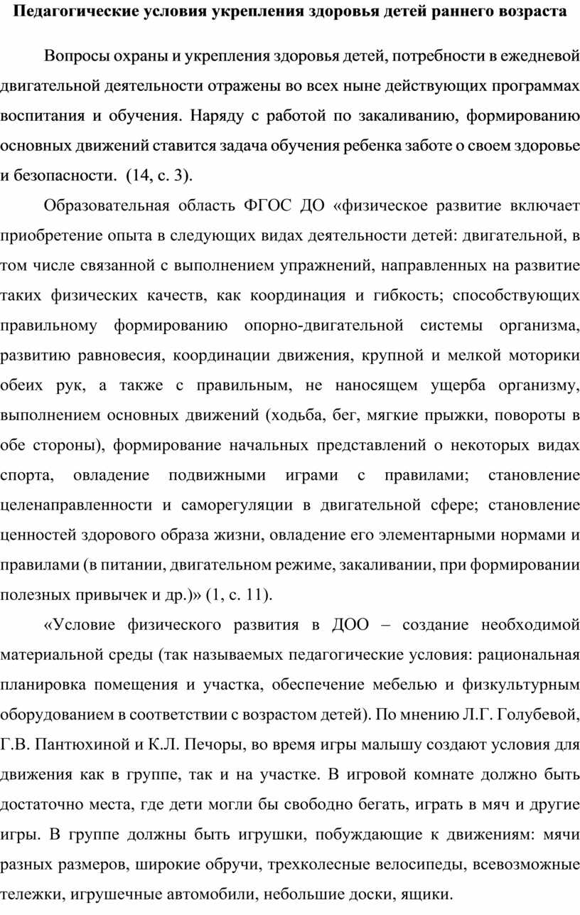 «Условие физического развития в ДОО – создание необходимой материальной среды (так называемых педагогические условия: рациональная планировка помещения и участка, обеспечение мебелью и физкультурным оборудованием в соответствии с возрастом детей). По мнению Л.Г. Голубевой, Г.В. Пантюхиной и К.Л. Печоры, во время игры малышу создают условия для движения как в группе, так и на участке. В игровой комнате должно быть достаточно места, где дети могли бы свободно бегать, играть в мяч и другие игры. В группе должны быть игрушки, побуждающие к движениям: мячи разных размеров, широкие обручи, трехколесные велосипеды, всевозможные тележки, игрушечные автомобили, небольшие доски, ящики.