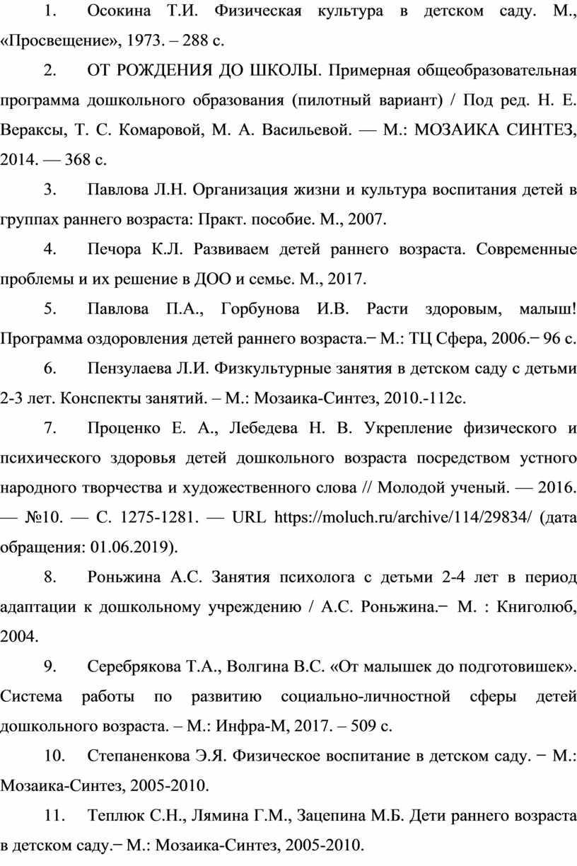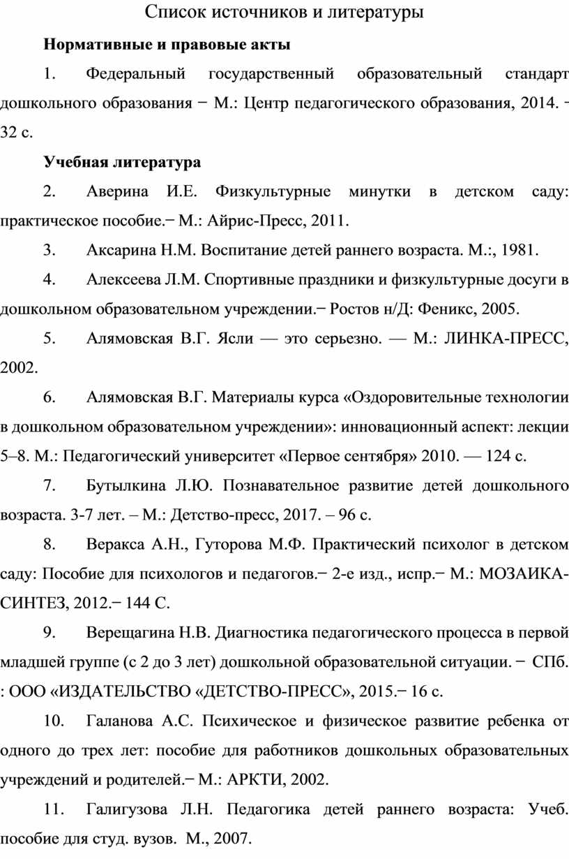 10. Галанова А.С. Психическое и физическое развитие ребенка от одного до трех лет: пособие для работников дошкольных образовательных учреждений и родителей. ̶ М.: АРКТИ, 2002.