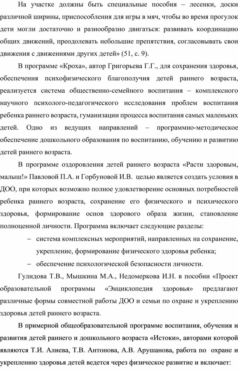 В примерной общеобразовательной программе воспитания, обучения и развития детей раннего и дошкольного возраста «Истоки», авторами которой являются Т.И. Алиева, Т.В. Антонова, А.В. Арушанова, работа по охране и укреплению здоровья детей ведется через физическое развитие и включает: «…примерный режим дня; рекомендации по закаливанию малышей, обеспечению безопасности жизнедеятельности; в четкой последовательности раскрывается содержание работы по развитию движений (первый год жизни – по кварталам, второй – по полугодиям; третий – по основным видам движений)» (17, с. 10).