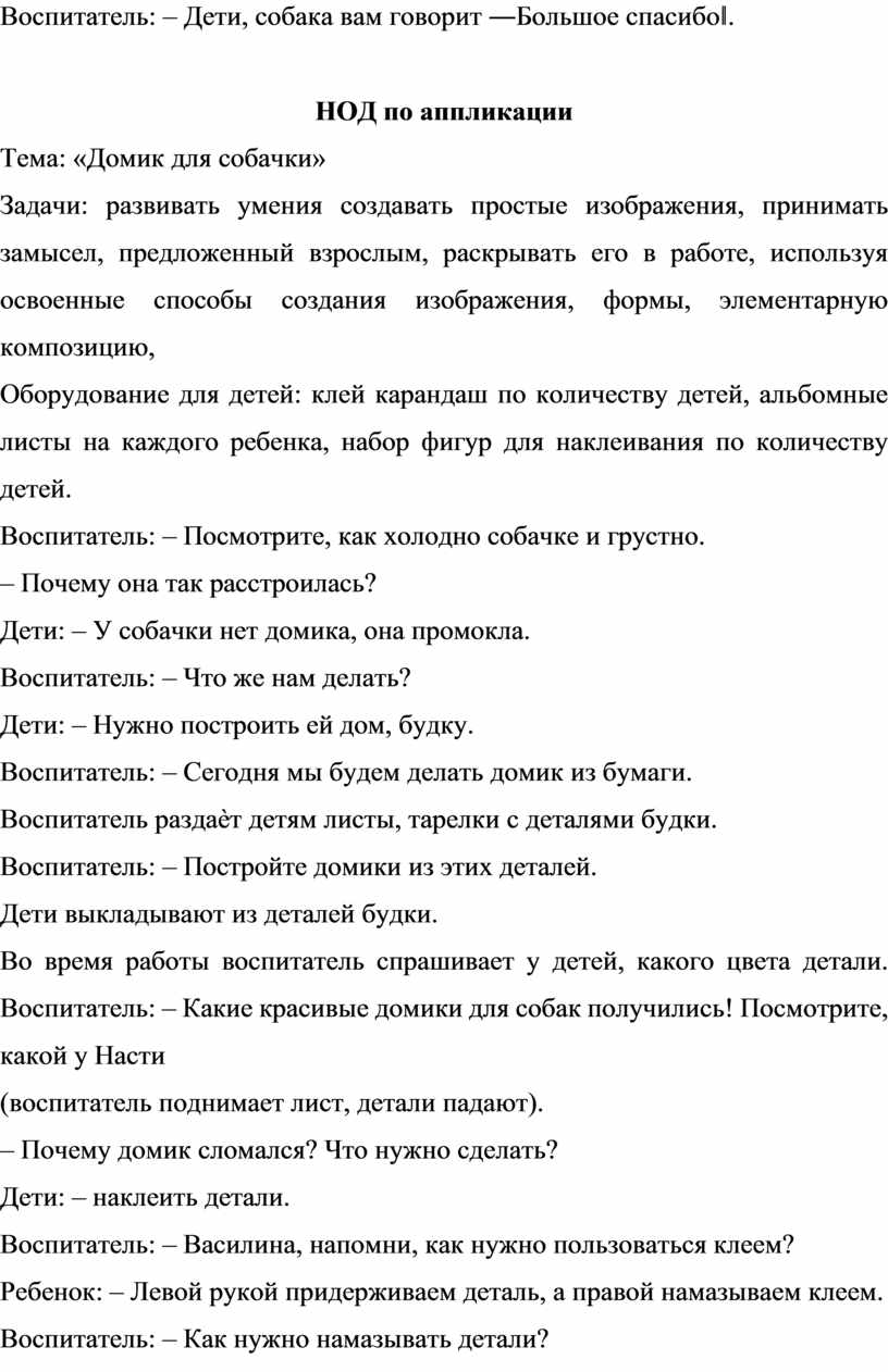 Во время работы воспитатель спрашивает у детей, какого цвета детали. Воспитатель: – Какие красивые домики для собак получились! Посмотрите, какой у Насти