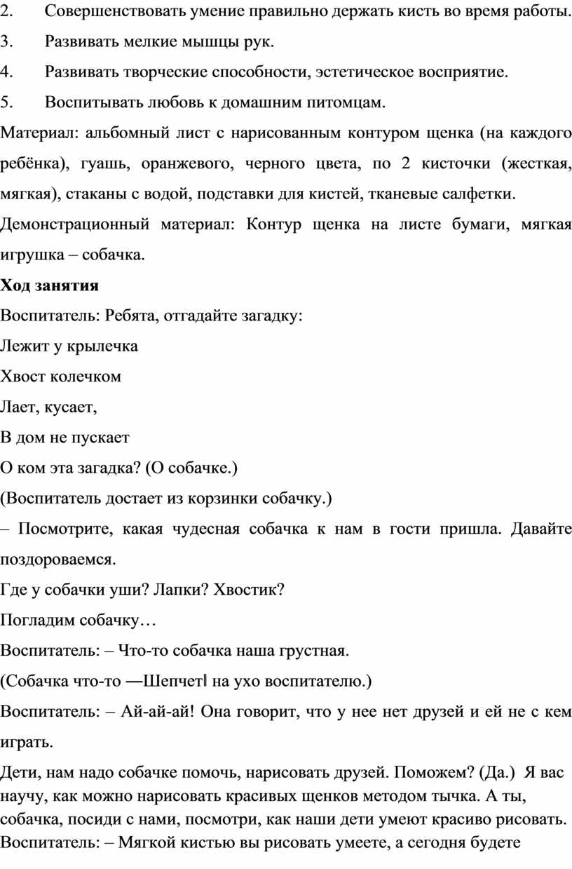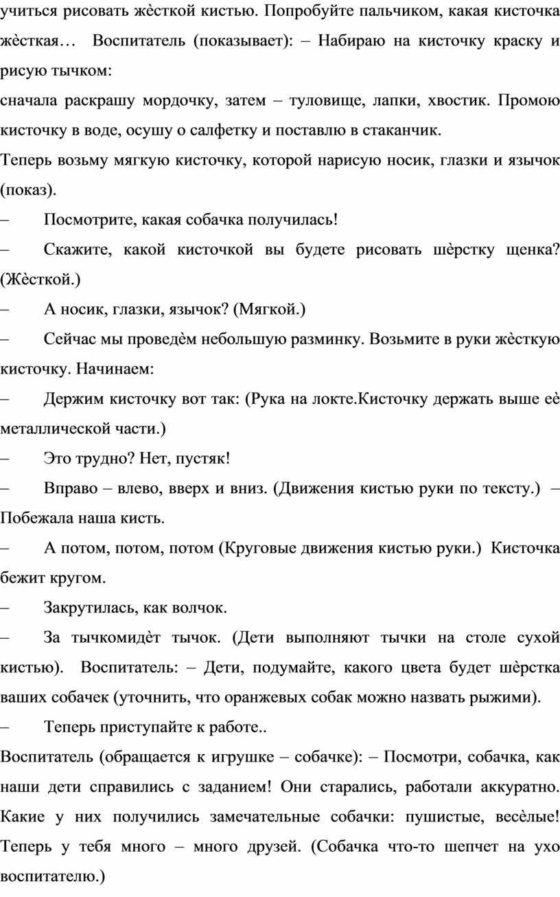– За тычкомидѐт тычок. (Дети выполняют тычки на столе сухой кистью). Воспитатель: – Дети, подумайте, какого цвета будет шѐрстка ваших собачек (уточнить, что оранжевых собак можно назвать рыжими).