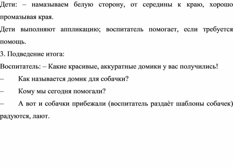 Воспитатель (обращается к игрушке – собачке): – Посмотри, собачка, как наши дети справились с заданием! Они старались, работали аккуратно. Какие у них получились замечательные собачки: пушистые, весѐлые! Теперь у тебя много – много друзей. (Собачка что-то шепчет на ухо воспитателю.)