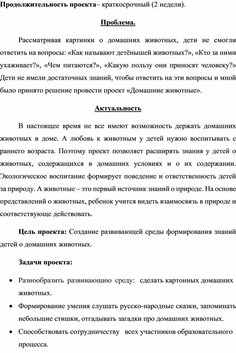 В настоящее время не все имеют возможность держать домашних животных в доме. А любовь к животным у детей нужно воспитывать с раннего возраста. Поэтому проект позволяет расширять знания у детей о животных, содержащихся в домашних условиях и о их содержании. Экологическое воспитание формирует поведение и ответственность детей за природу. А животные – это первый источник знаний о природе. На основе представлений о животных, ребенок учится видеть взаимосвязь в природе и соответствующе действовать.