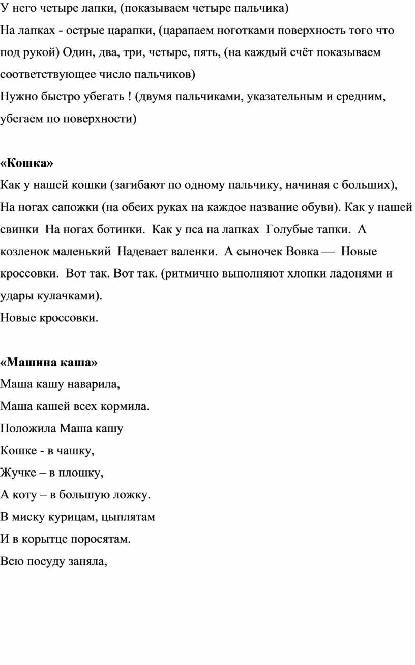 На лапках - острые царапки, (царапаем ноготками поверхность того что под рукой) Один, два, три, четыре, пять, (на каждый счёт показываем соответствующее число пальчиков)