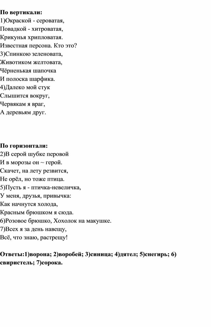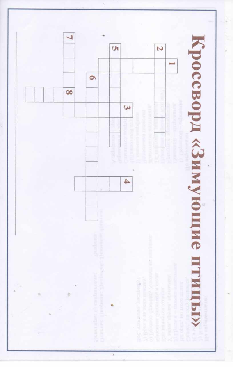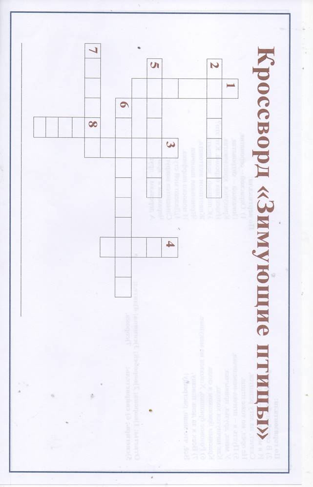 летать? -Что для птицы страшнее зимой: холод или голод? Знакомство с народным календарём, с упоминанием зимующих птиц, обсуждение народных примет Дидактические игры: «Рыбалка», «Спор птиц», «Каких птиц зимой не увидишь?», «Четвёртый лишний», «Летает, плавает, бежит». «Какая по счёту птица» Разгадывание кроссворда «Зимующие птицы» «Сосчитай-ка» (согласование числительных и существительных) |