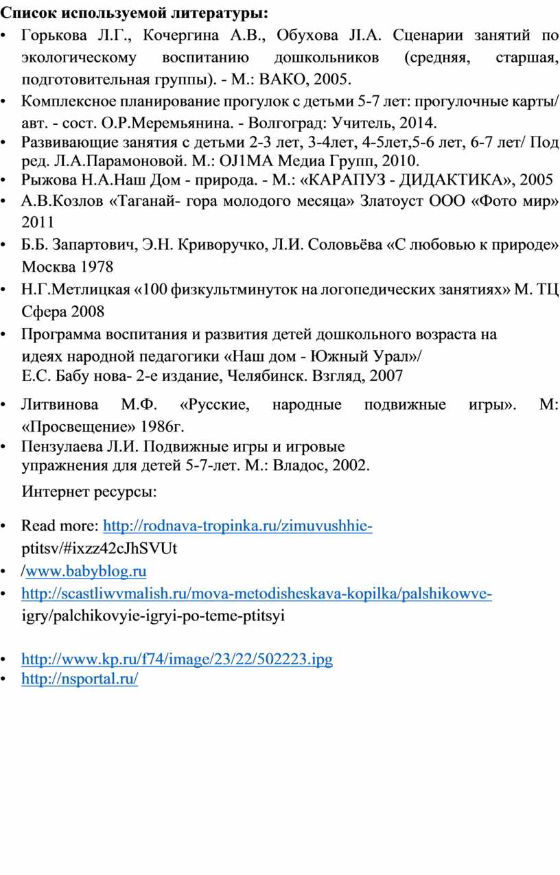 • Горькова Л.Г., Кочергина А.В., Обухова JI.A. Сценарии занятий по экологическому воспитанию дошкольников (средняя, старшая, подготовительная группы). - М.: ВАКО, 2005.