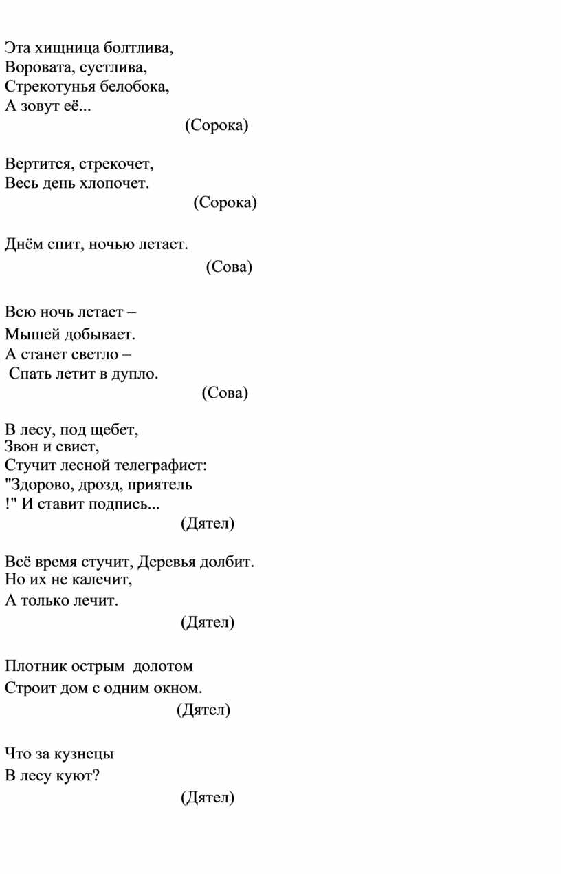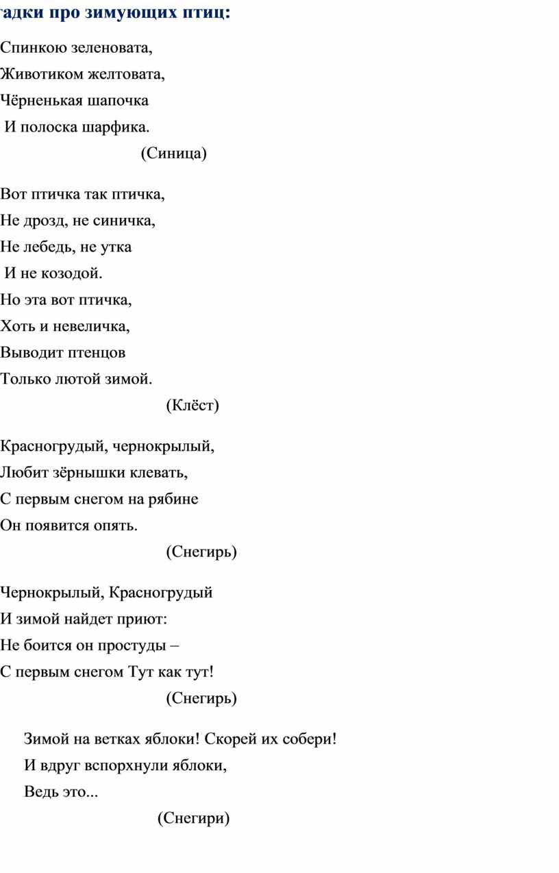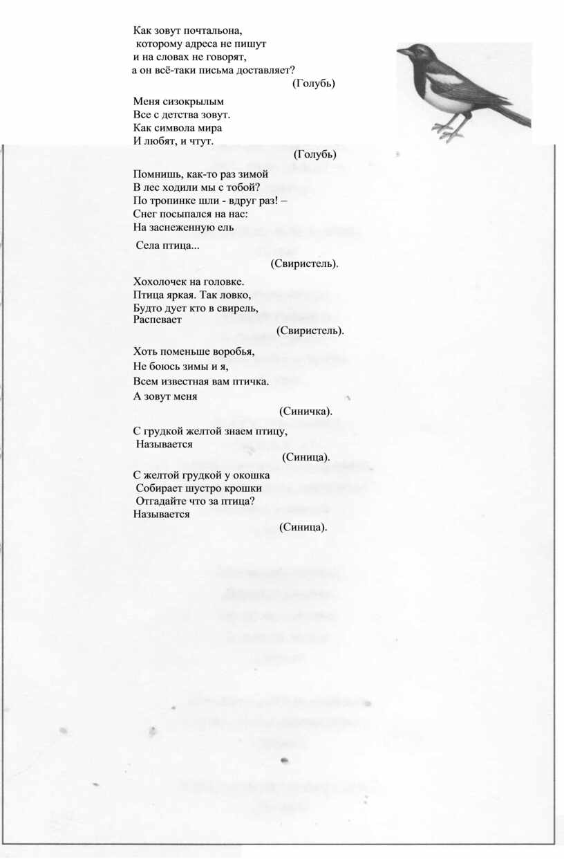 • Почему снегиря назвали снегирем? (появляется с первым снегом) • Какую птицу называют “лесным доктором? (Дятла) • Дитя любых пернатых (птенец). • Какая птица одета в желтую блузку с черным галстуком? (синица) • Что птицам страшнее зимой холод или голод? (голод) • Какая птица выводит птенцов зимой? (клест) |