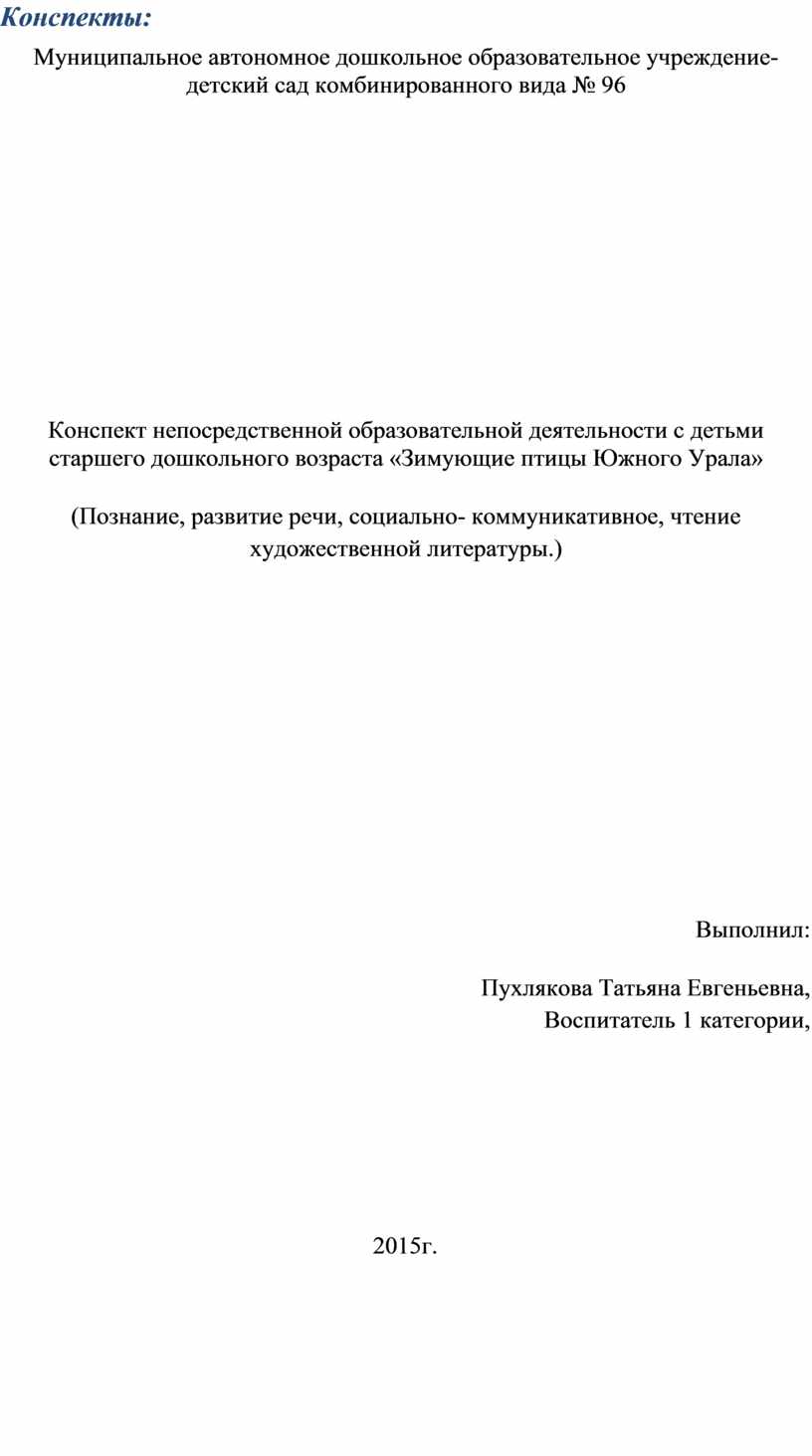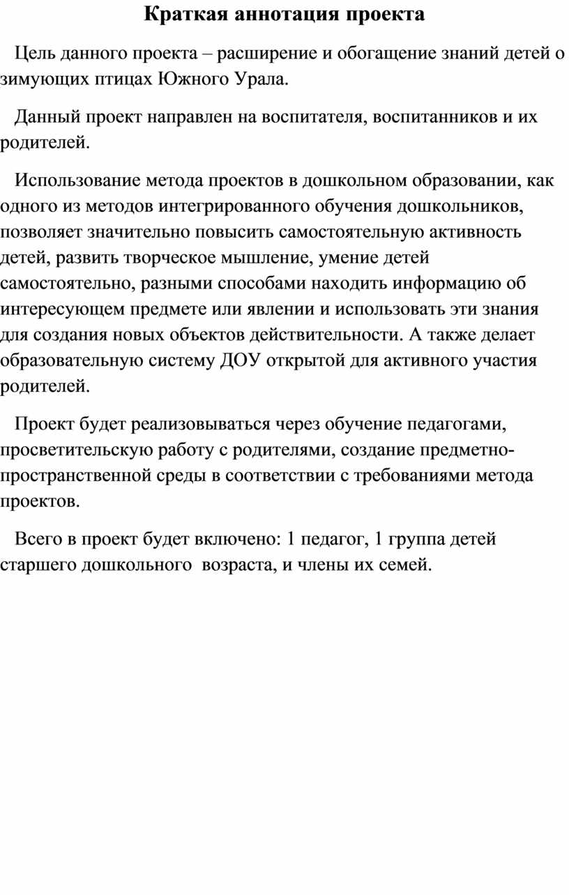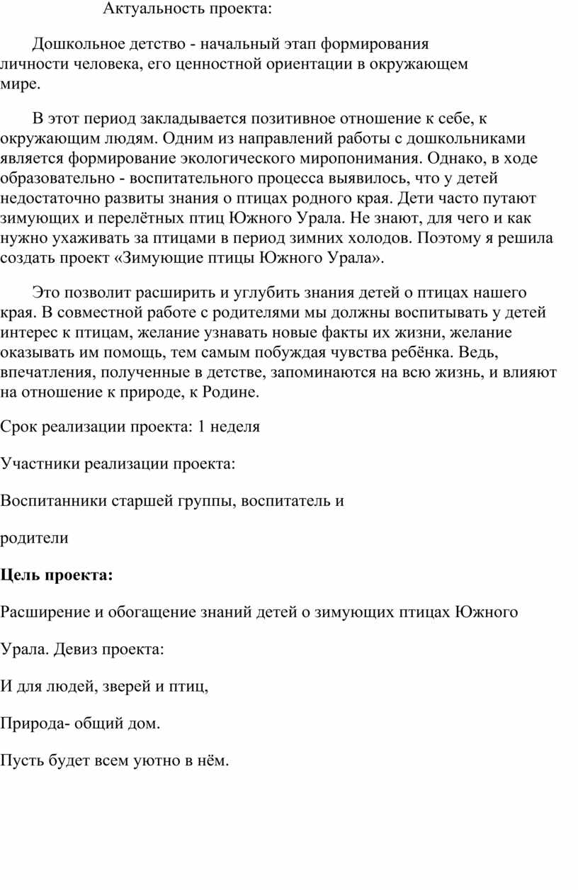 В этот период закладывается позитивное отношение к себе, к окружающим людям. Одним из направлений работы с дошкольниками является формирование экологического миропонимания. Однако, в ходе образовательно - воспитательного процесса выявилось, что у детей недостаточно развиты знания о птицах родного края. Дети часто путают зимующих и перелётных птиц Южного Урала. Не знают, для чего и как нужно ухаживать за птицами в период зимних холодов. Поэтому я решила создать проект «Зимующие птицы Южного Урала».