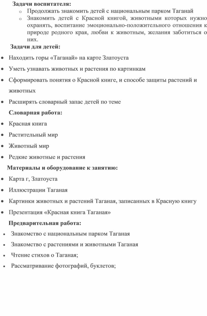 Мой родной, любимый город Златоуст! Красив, но маленький и пусть! Зато жить в нём очень прекрасно, Даже, когда на небе ненастно. Есть три горы под названием Таганай. Большой, малый, средний – выбирай. Там окружают горы, леса, реки, озёра, Иди и изучай! Красоту такую цени, люби, оберегай. В лесах Таганая растут грибочки, ягодки, цветочки. Живут там большие и малые зверята: Бабочки, птички, лягушата. Можно и камни самоцветы найти, Если будешь трудиться, найдёшь, и бери. Изучай природу родного края И живи в красоте такой, мечтая. Воспитатель: -Дети, о чём это стихотворение? А кто может показать Таганай на карте? -Ребята, в нашем крае очень много разных растений и животных. Давайте вспомним, какие растения растут на Таганае Какие животные обитают на Таганае? Птицы? Насекомые? Кто живет в реке? (Ответы детей). Среди них есть такие, которых осталось очень мало. Их так и называют – редкие. Как вы думаете, почему они стали редкими? (Ответы детей). Редкие животные и растения в нашей стране, и в других странах тоже, охраняются законом. Но недобрые люди часто нарушают этот закон. Человек часто бывает очень жесток по отношению к растениям и животным. Очень часто люди не жалеют их, уничтожают для своих целей. Одни существа страдают из-за красивого меха, другие – из-за вкусного мяса, третьи – из-за того, что люди их боятся. Постепенно растений и животных остается все меньше и меньше. Задумались люди: как остановить это безобразие, не допустить исчезновения ни одного живого существа. Дерево, трава, цветок и птица Не всегда умеют защититься. Если будут уничтожены они, На планете мы останемся одни. И вот ученые решили издать Красную Книгу. Но почему именно красную, а не какого-либо другого цвета? Потому что красный цвет – цвет опасности! Внимание! Остановись, оглянись, подумай, человек! Подумай о природе! Не слишком ли вольно мы пользуемся щедростью природы? Все только берем и берем. -Как вы думаете, от человека зависит красота природы? А всегда ли человек помогает природе? (Ответы детей). А ведь мы крепко-накрепко связаны с растениями и животными. Уничтожим птиц – насекомые съедят всю зелень – люди не смогут есть плоды, овощи. Так всегда происходит в природе: исчез один – заболел другой – погиб третий. Посмотрите презентацию (Показ). Здесь изображены животные, птицы, насекомые которые нуждаются в защите. Их в национальном парке Таганай их осталось мало. Кого вы узнаете на этих картинках? (Ответы детей). А теперь давайте посмотрим, как вы запомнили всех животных. -Предлагаю вам поиграть в игру. Вот картинки редких животных Нужно все эти картинки разложить в разные коробки. В коробку с изображением жука складывайте картинки с изображением насекомых. В коробку с изображением дятла …? Птиц. В коробку с зайцем …? Зверей. В коробку с рыбкой …? Речных обитателей. Растения тоже нуждаются в нашей защите. (Показ презентации). Многие из этих растений вам знакомы. Какие? (Ответы детей). А ведь их тоже осталось мало. Педагог: Ребята! Представьте себе деревьями (каждый выбирает свое любимое дерево из уже знакомых детям, и каждую услышанную от педагога фразу пытается продемонстрировать жестами). - Мои корни глубоко вросли в землю - Мой ствол, мои ветки тянуться к солнцу Это деревья в лесу. Локти согнули, кисти встряхнули Ветер сбивает росу Плавно руками помашем Это к нам птицы летят. Как они сяд
