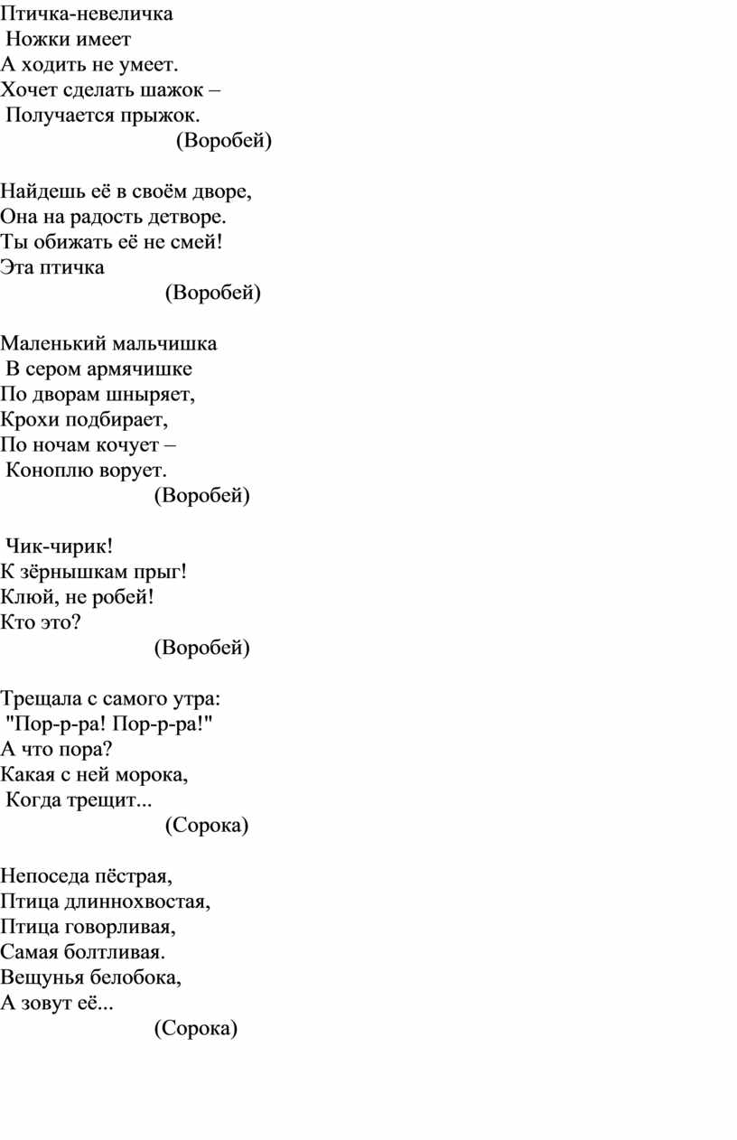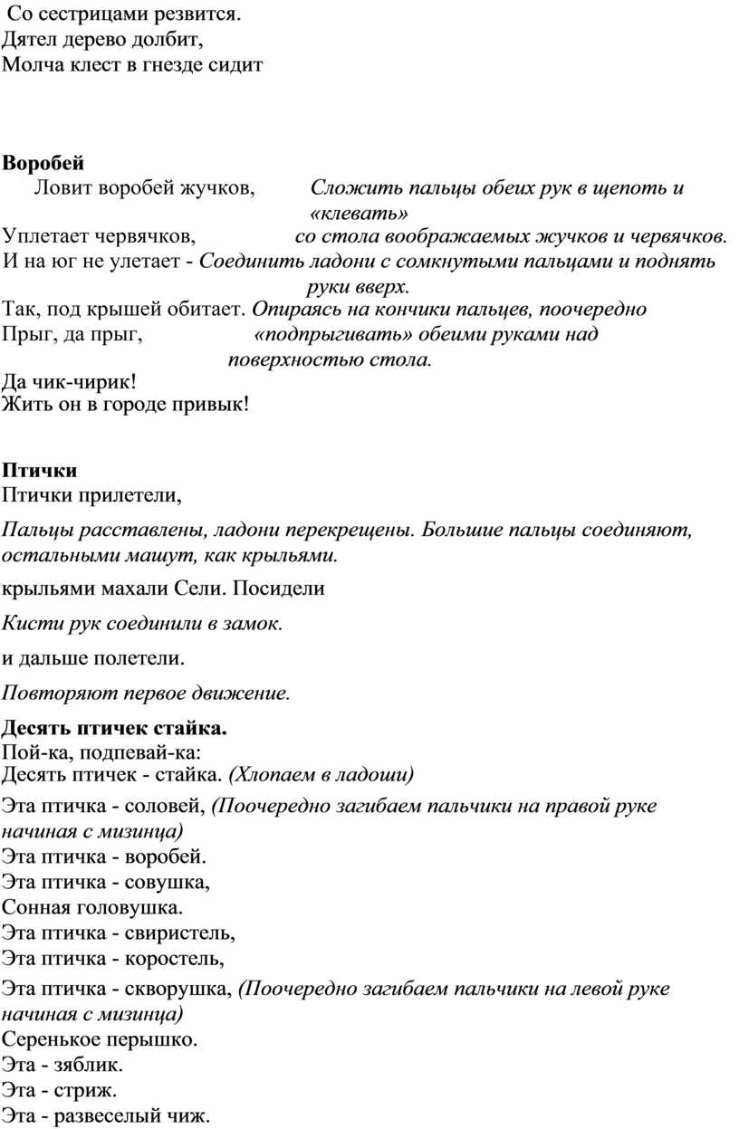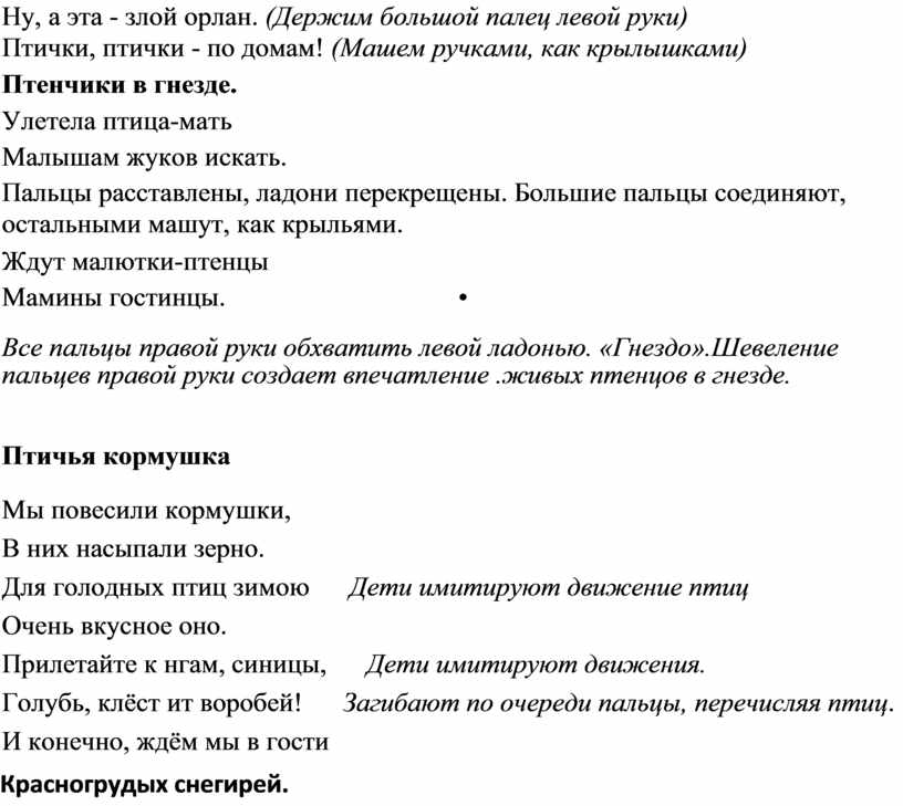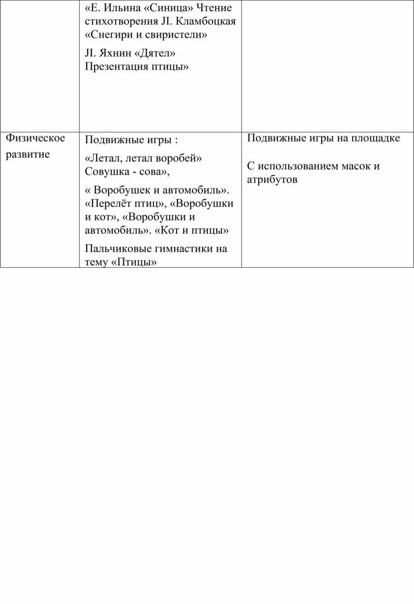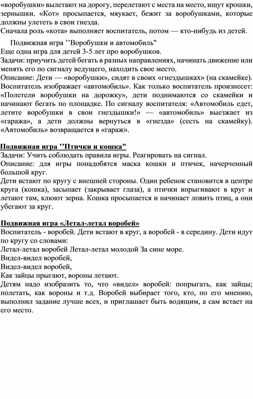 Подвижные игры : «Летал, летал воробей» Совушка - сова», « Воробушек и автомобиль». «Перелёт птиц», «Воробушки и кот», «Воробушки и автомобиль». «Кот и птицы» Пальчиковые гимнастики на тему «Птицы» |