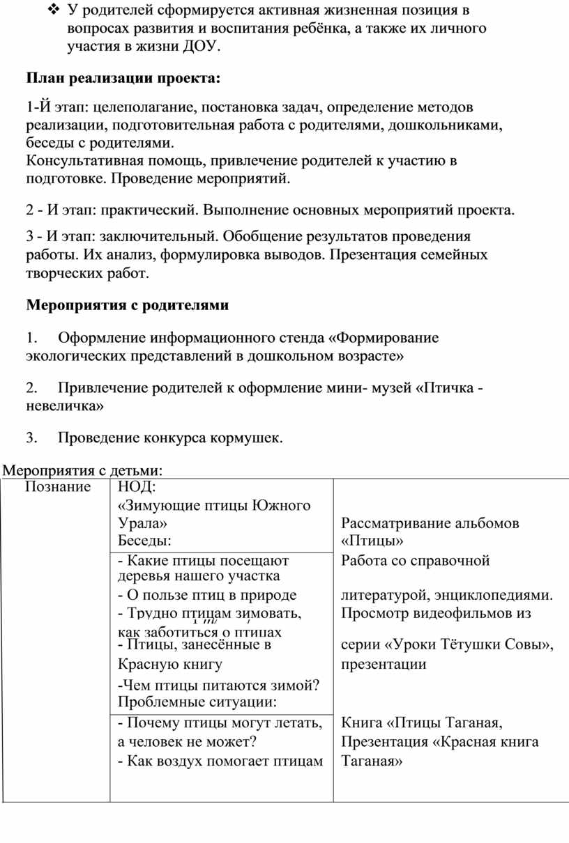Проект будет реализовываться через обучение педагогами, просветительскую работу с родителями, создание предметно- пространственной среды в соответствии с требованиями метода проектов.