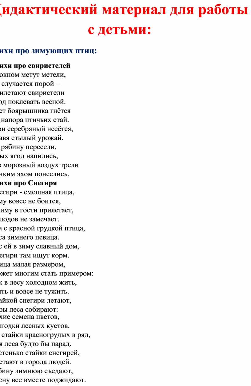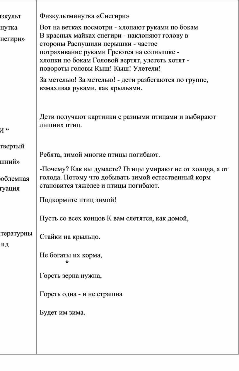 Физкультминутка «Снегири» Вот на ветках посмотри - хлопают руками по бокам В красных майках снегири - наклоняют голову в стороны Распушили перышки - частое потряхивание руками Греются на солнышке - хлопки по бокам Головой вертят, улететь хотят - повороты головы Кыш! Кыш! Улетели! За метелью! За метелью! - дети разбегаются по группе, взмахивая руками, как крыльями. Дети получают картинки с разными птицами и выбирают лишних птиц. Ребята, зимой многие птицы погибают. -Почему? Как вы думаете? Птицы умирают не от холода, а от голода. Потому что добывать зимой естественный корм становится тяжелее и птицы погибают. Подкормите птиц зимой! Пусть со всех концов К вам слетятся, как домой, Стайки на крыльцо. Не богаты их корма, * Горсть зерна нужна, Горсть одна - и не страшна Будет им зима.
