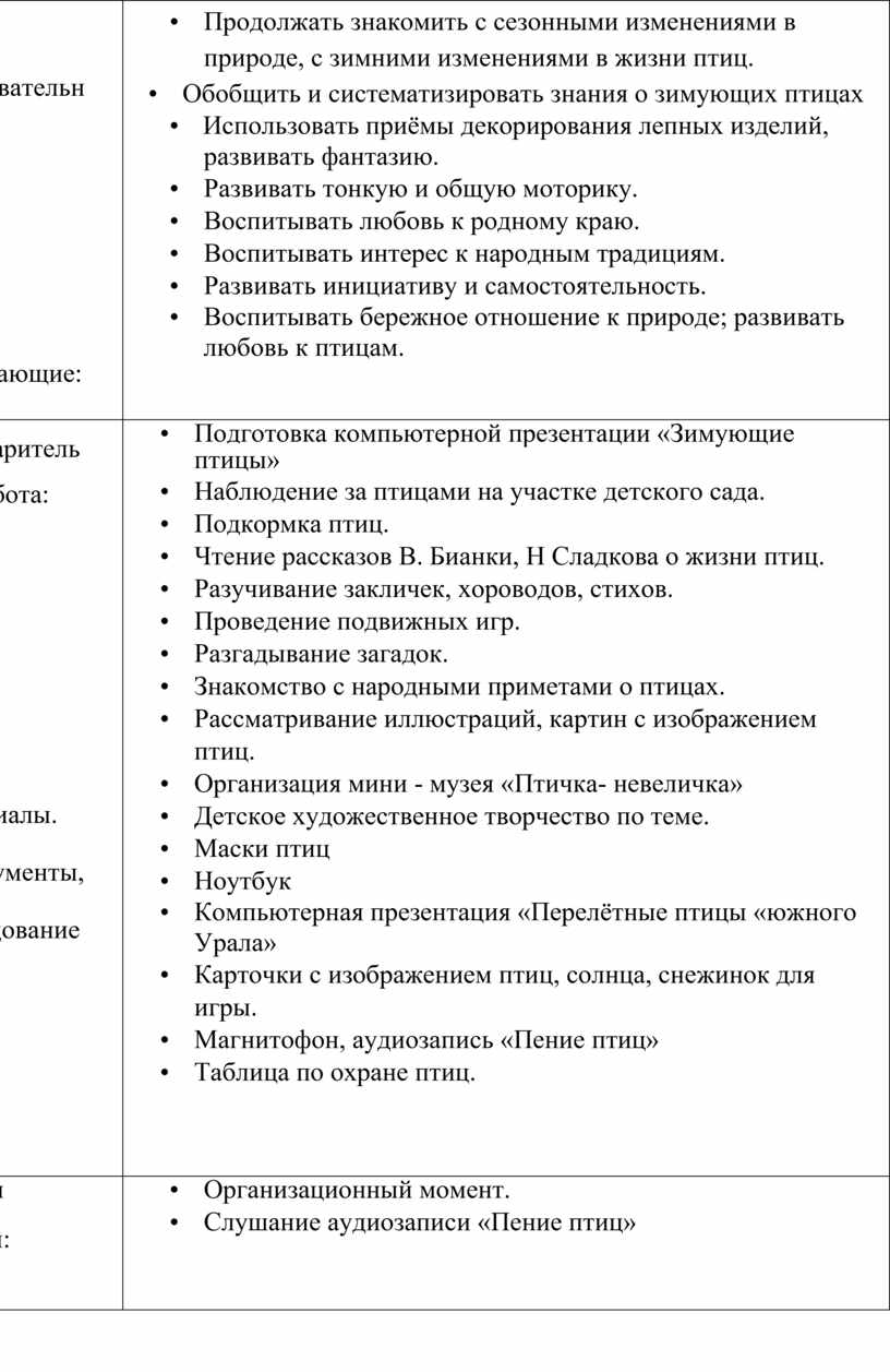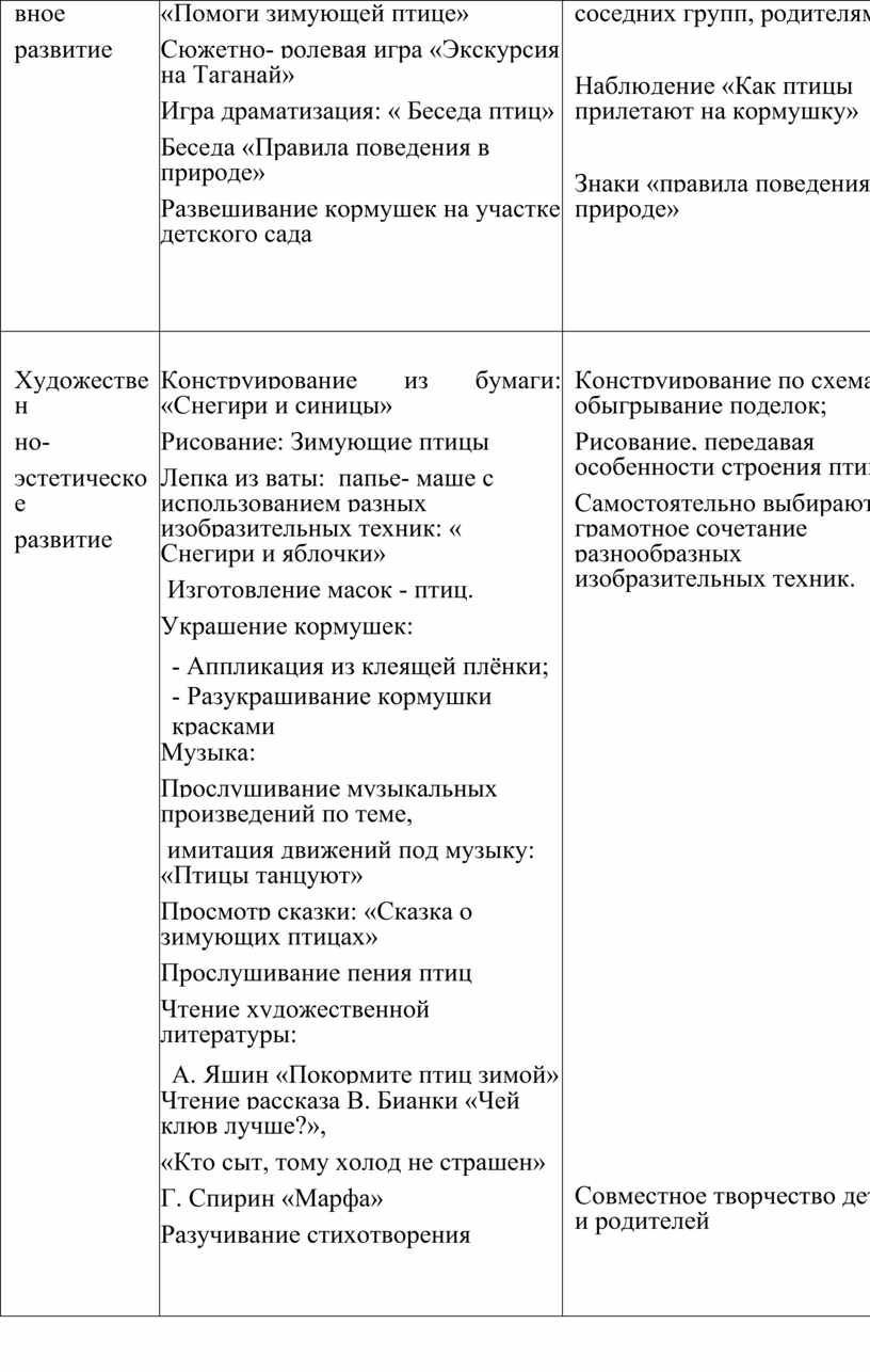 Конструирование из бумаги: «Снегири и синицы» Рисование: Зимующие птицы Лепка из ваты: папье- маше с использованием разных изобразительных техник: « Снегири и яблочки» Изготовление масок - птиц. Украшение кормушек: - Аппликация из клеящей плёнки; - Разукрашивание кормушки красками Музыка: Прослушивание музыкальных произведений по теме, имитация движений под музыку: «Птицы танцуют» Просмотр сказки: «Сказка о зимующих птицах» Прослушивание пения птиц Чтение художественной литературы: A. Яшин «Покормите птиц зимой» Чтение рассказа В. Бианки «Чей клюв лучше?», «Кто сыт, тому холод не страшен» Г. Спирин «Марфа» Разучивание стихотворения |