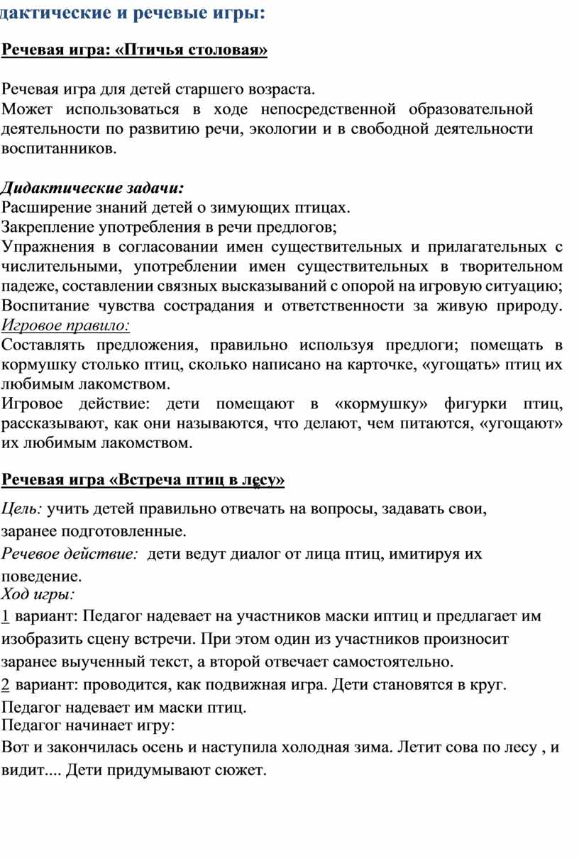 Составление описательных рассказов о зимующих птицах, Придумывание сказки детьми: «Зимовье воробушка», «Если бы я был птицей» Составление рассказов о бережном отношении к птицам» Заучивание скороговорок о зимующих птицах. Разгадывание загадок о зимующих птицах. Речевые игры: «Назови птицу ласково», «Посели птиц в кормушку», «Скажи наоборот» Кто как голос подает» (образование новых слов от звукоподражания) • Составление предложений по картине