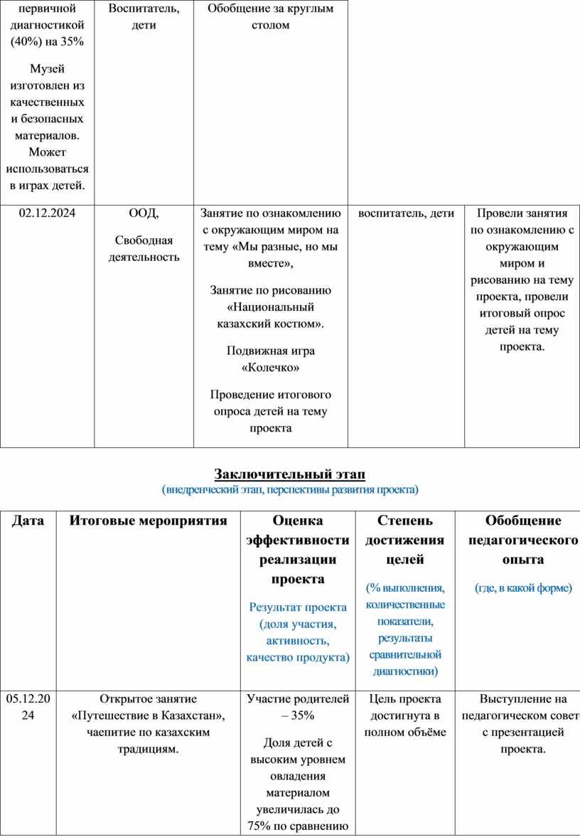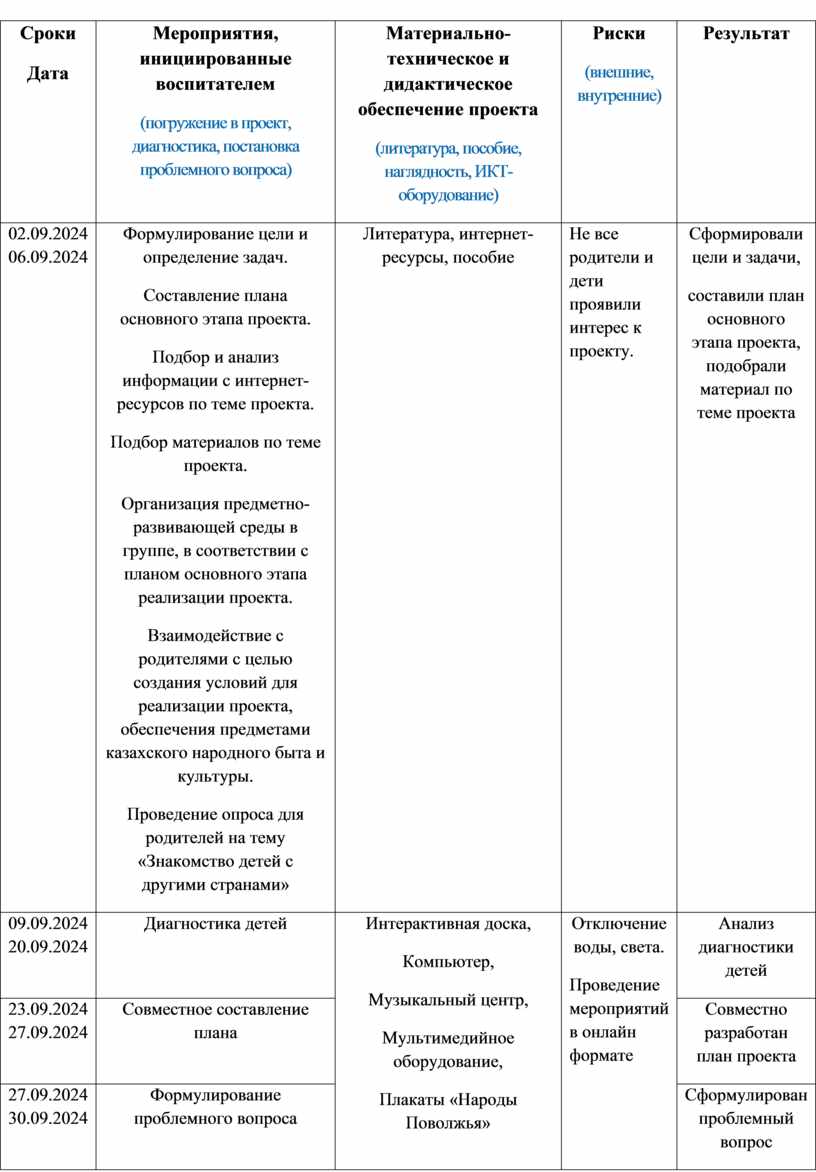 Формулирование цели и определение задач. Составление плана основного этапа проекта. Подбор и анализ информации с интернет-ресурсов по теме проекта. Подбор материалов по теме проекта. Организация предметно-развивающей среды в группе, в соответствии с планом основного этапа реализации проекта. Взаимодействие с родителями с целью создания условий для реализации проекта, обеспечения предметами казахского народного быта и культуры. Проведение опроса для родителей на тему «Знакомство детей с другими странами»  |