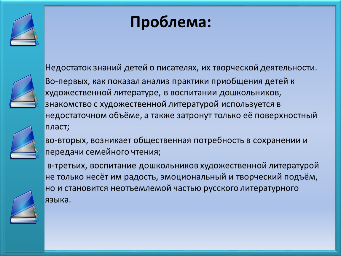 Недостаток знаний детей о писателях, их творческой деятельности.