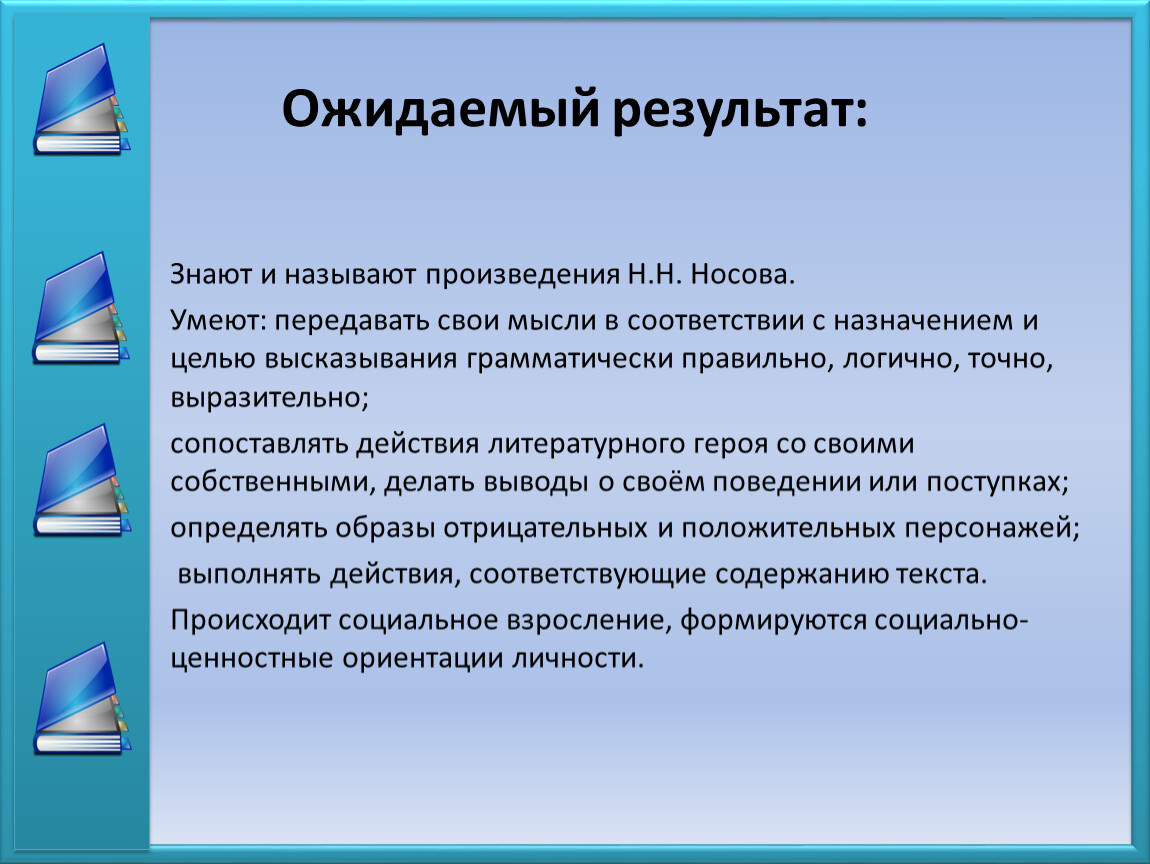 Цель: знакомство с творчеством Н.Н. Носова. Развитие эмоциональной отзывчивости через произведения Н. Носова проживание, и понимание морально-нравственных основ человека в социальной среде.