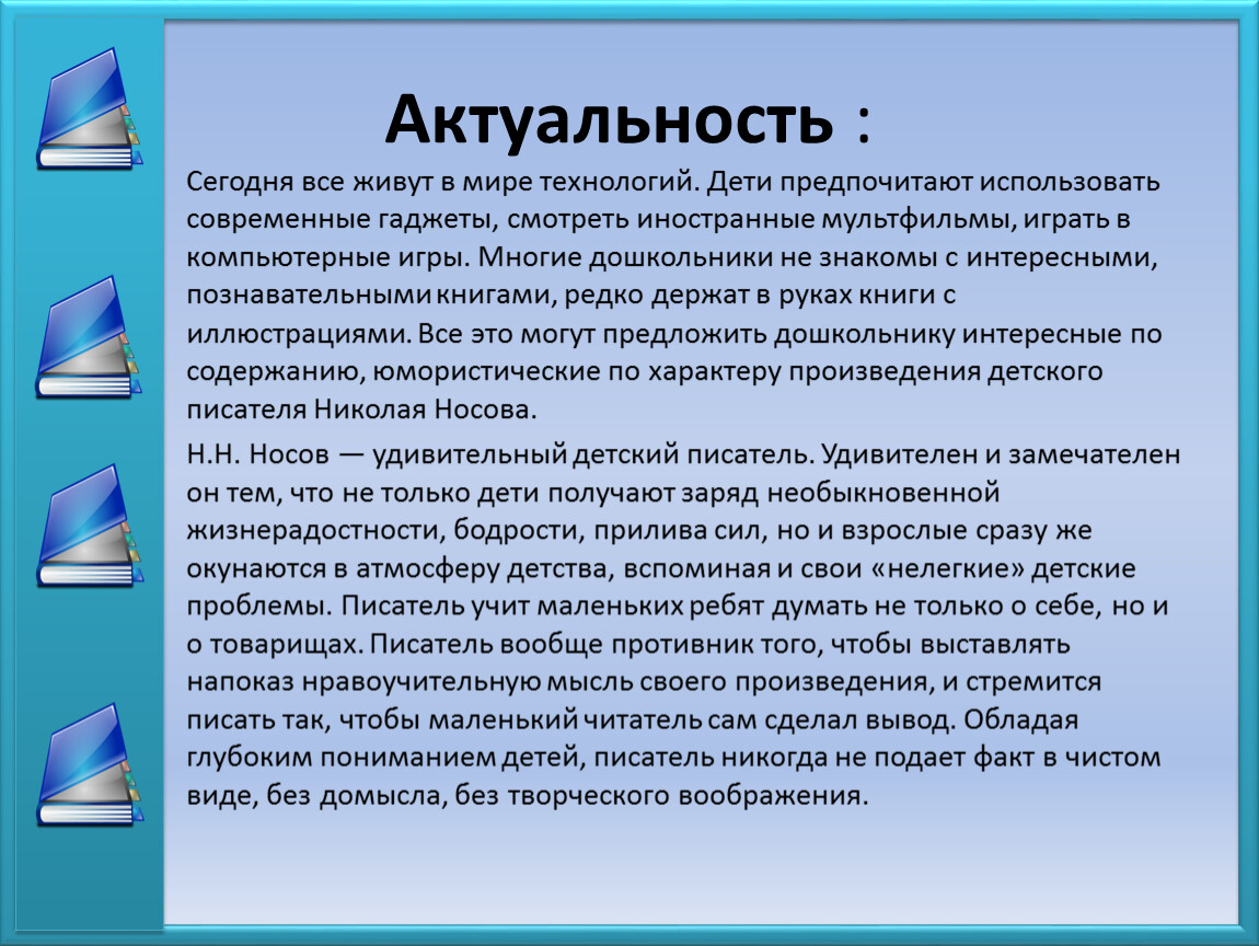 Сегодня все живут в мире технологий. Дети предпочитают использовать современные гаджеты, смотреть иностранные мультфильмы, играть в компьютерные игры. Многие дошкольники не знакомы с интересными, познавательными книгами, редко держат в руках книги с иллюстрациями. Все это могут предложить дошкольнику интересные по содержанию, юмористические по характеру произведения детского писателя Николая Носова.