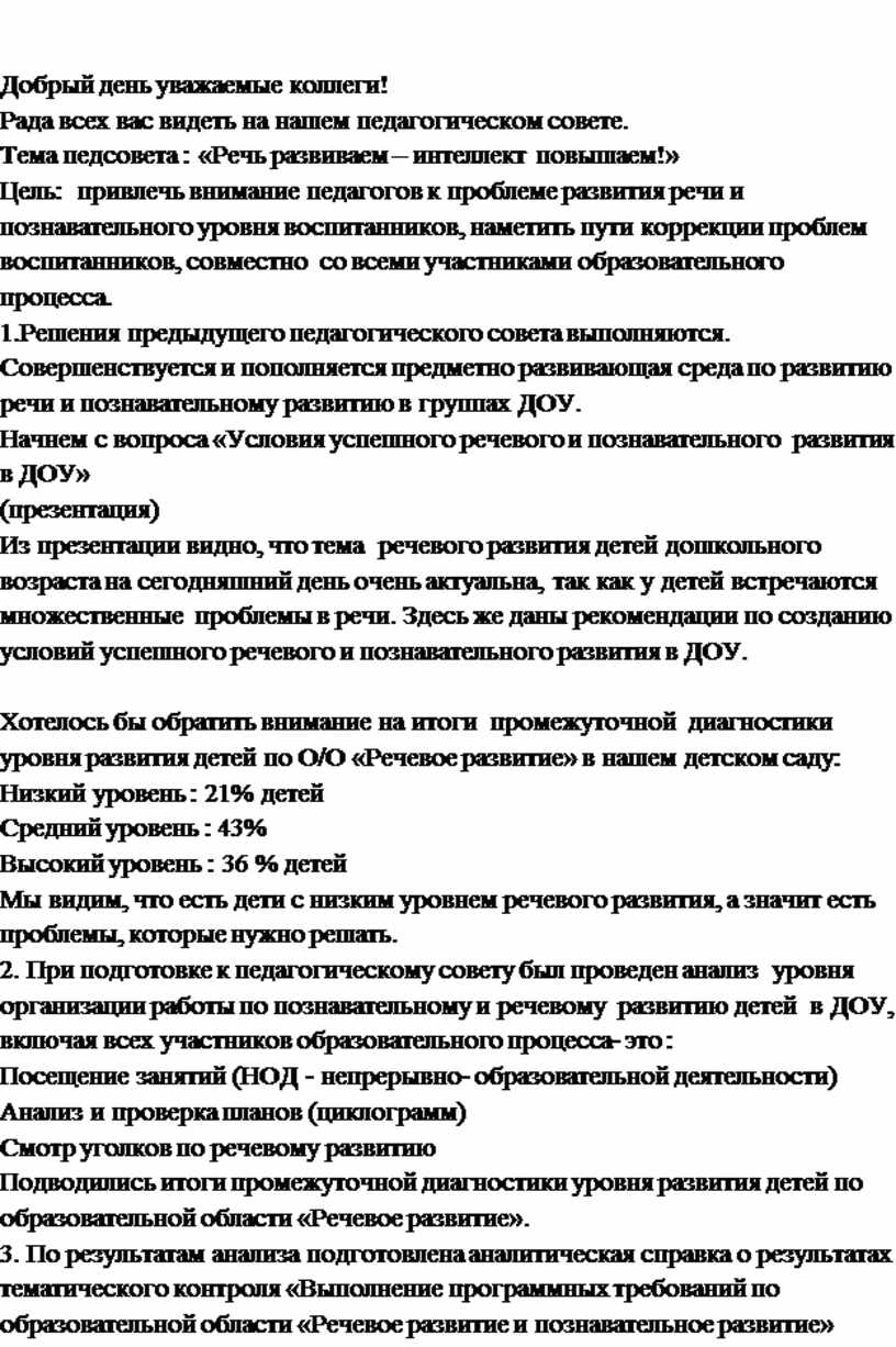 1.Решения предыдущего педагогического совета выполняются. Совершенствуется и пополняется предметно развивающая среда по развитию речи и познавательному развитию в группах ДОУ.