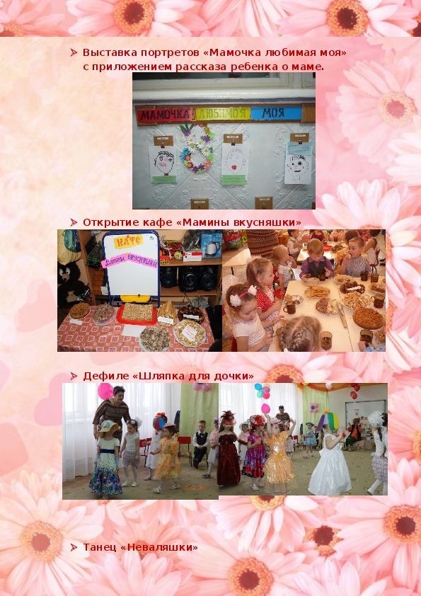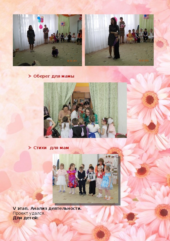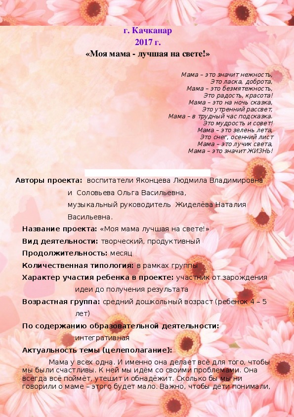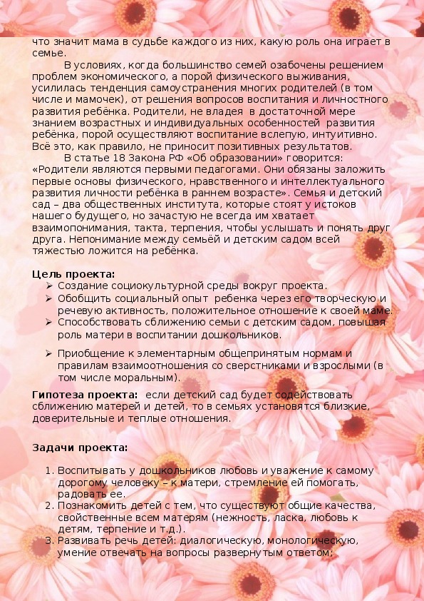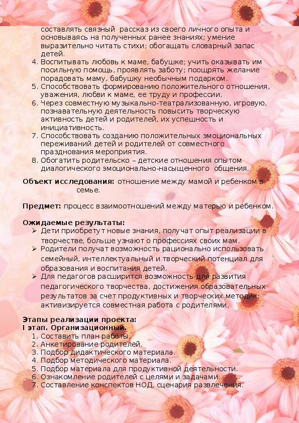 Данный материал - это результат проектной деятельности с детьми 4 - 5 лет, посвященный Дню матери. В материале указаны актуальность, цели, задачи, объект и предмет исследования,а так же все этапы реализации проекта. На этапе - презентация результатов представлены фотоматериалы итогового мероприятия с кратким описанием.