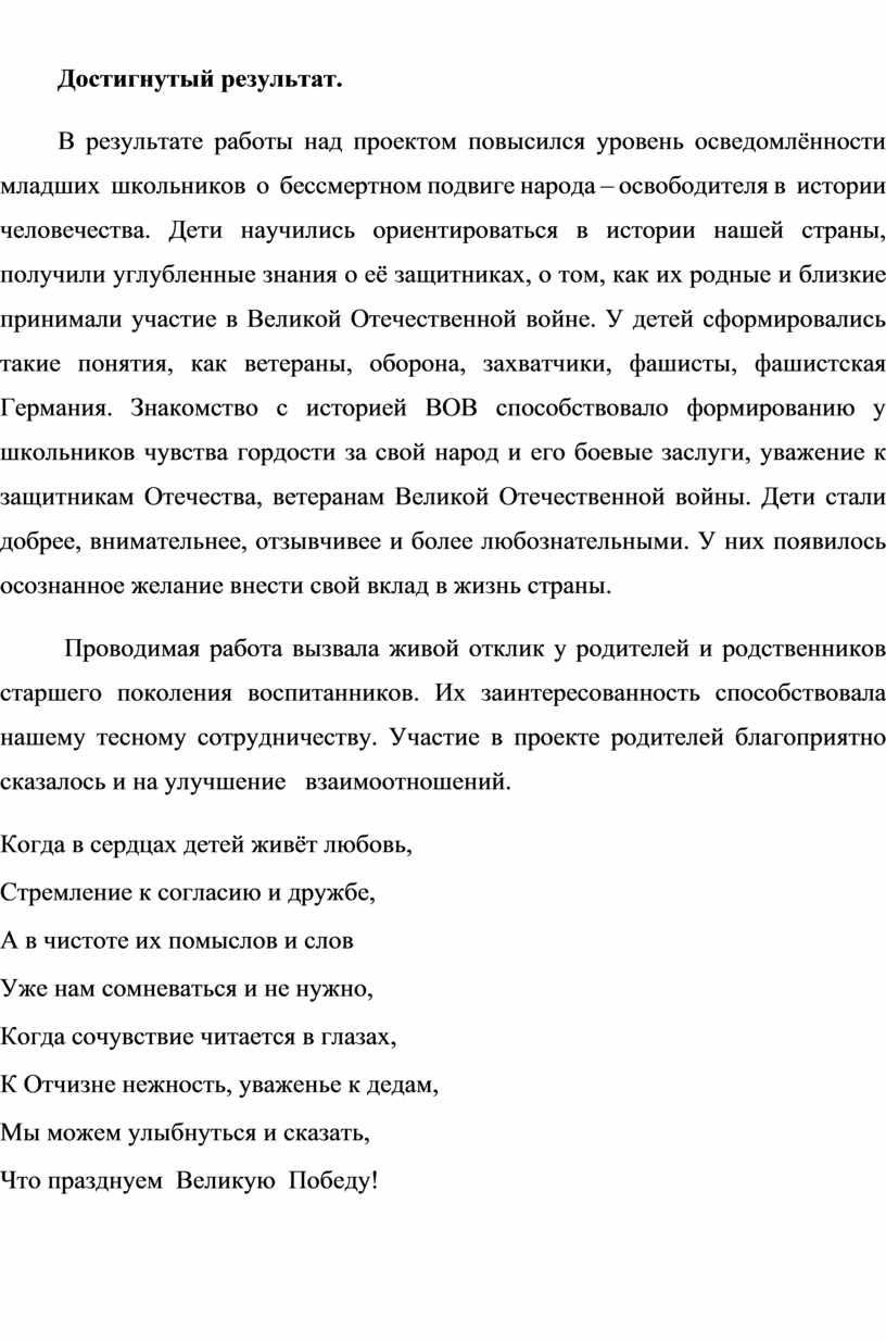 В результате работы над проектом повысился уровень осведомлённости младших школьников о бессмертном подвиге народа – освободителя в истории человечества. Дети научились ориентироваться в истории нашей страны, получили углубленные знания о её защитниках, о том, как их родные и близкие принимали участие в Великой Отечественной войне. У детей сформировались такие понятия, как ветераны, оборона, захватчики, фашисты, фашистская Германия. Знакомство с историей ВОВ способствовало формированию у школьников чувства гордости за свой народ и его боевые заслуги, уважение к защитникам Отечества, ветеранам Великой Отечественной войны. Дети стали добрее, внимательнее, отзывчивее и более любознательными. У них появилось осознанное желание внести свой вклад в жизнь страны.