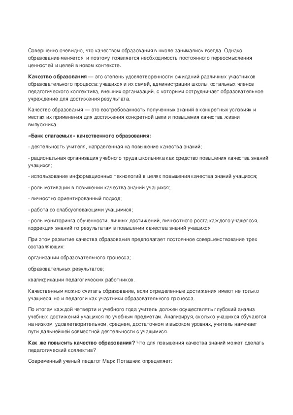 школьного образования – это специфическая область качества вообще, так как оно чрезвычайно