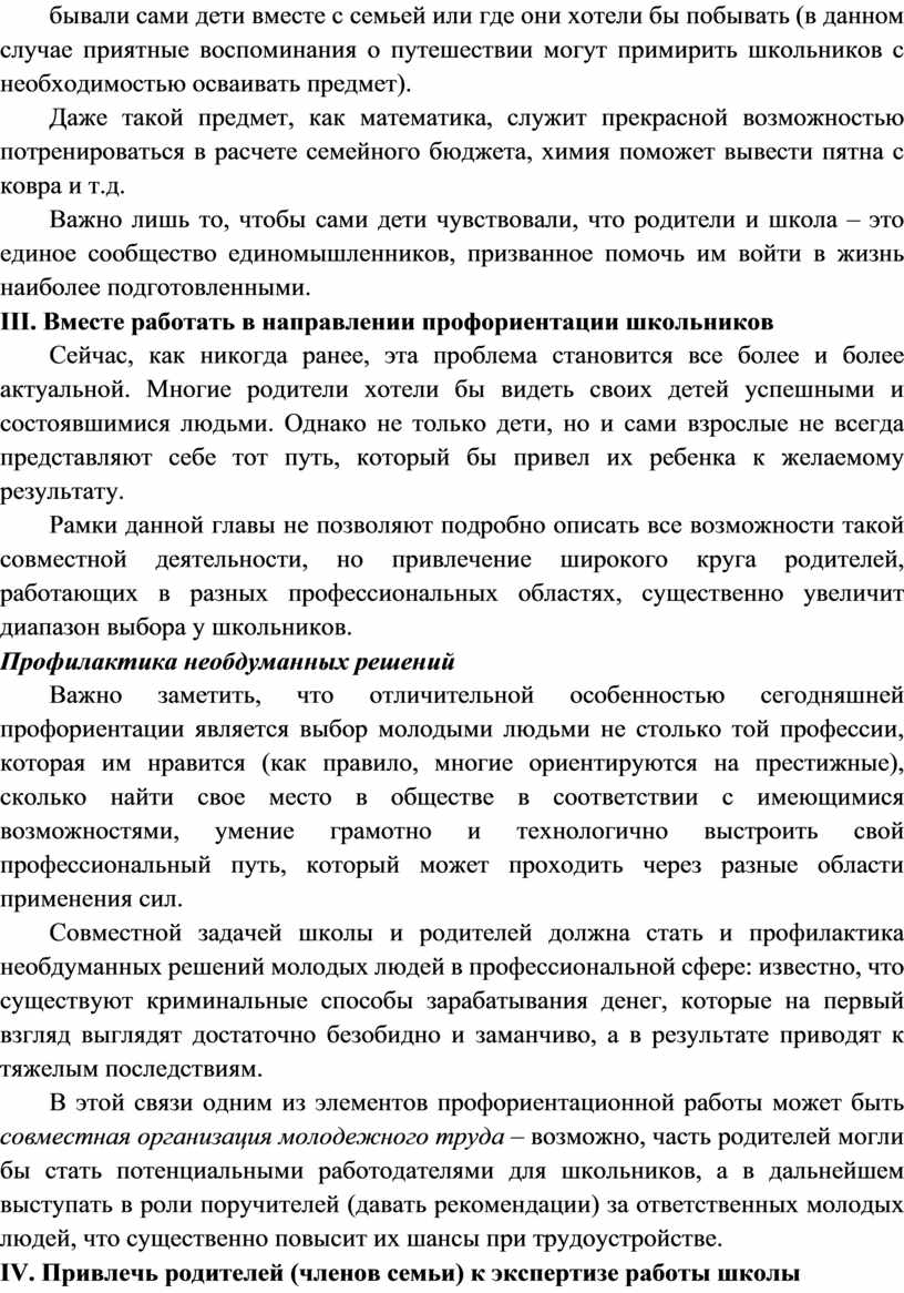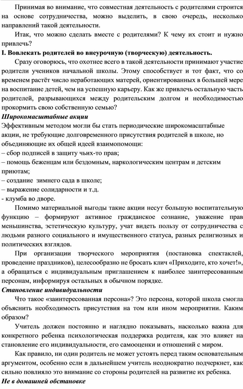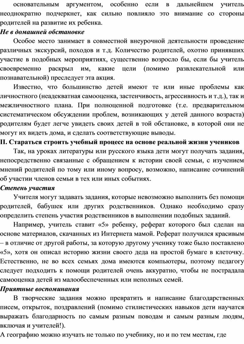 школе, но объединяющие их общей идеей взаимопомощи: - клумба во дворе. Помимо материальной выгоды такие акции несут большую воспитательную функцию – формируют активное гражданское сознание, уважение прав меньшинства, эстетическую культуру, учат видеть пользу от сотрудничества с людьми разного социального и имущественного статуса, разных религиозных и политических взглядов. При организации творческого мероприятия (постановка спектаклей, проведение праздников), целесообразно не бросать клич «Приходите, кто хочет!», а обращаться с индивидуальным приглашением к наиболее заинтересованным персонам, информируя остальных в обычном порядке. Становление индивидуальности Что такое «заинтересованная персона»? Это персона, которой школа смогла объяснить необходимость присутствия на том или ином мероприятии. Каким образом? Учитель должен постоянно и наглядно показывать, насколько важна для конкретного ребенка психологическая поддержка родителя, как это влияет на становление его индивидуальности, его самооценки и отношений с миром. Как правило, ни один родитель не может устоять перед таким основательным аргументом, особенно если в дальнейшем учитель неоднократно подчеркнет, как сильно повлияло это внимание со стороны родителей на развитие их ребенка. Не в домашней обстановке Особое место занимает в совместной внеурочной деятельности проведение различных экскурсий, походов и т.д. Количество родителей, охотно принявших участие в подобных мероприятиях, существенно возросло бы, если бы учитель своевременно раскрыл им, какие цели (помимо развлекательной или познавательной) преследует эта акция. Известно, что большинство детей имеют те или иные проблемы как личностного (неадекватная самооценка, застенчивость, агрессивность и т.д.), так и межличностного плана. При полноценной подготовке (т.е. предварительном систематическом обсуждении проблем, возникающих у детей данного возраста) родителям будет легче увидеть своих детей в той обстановке, в которой они не могут их видеть дома, и сделать соответствующие выводы. II. Стараться строить учебный процесс на основе реальной жизни учеников Так, на уроках литературы или русского языка дети могут получать задания, непосредственно связанные с обращением к истории своей семьи, с изучением мнений родителей по тому или иному вопросу, возможно, написание сочинений об участии членов семьи в тех или иных событиях. Степень участия Учителя могут задавать задания, которые невозможно выполнить без помощи родителей, бабушек или других родственников. Однако необходимо сразу определить степень участия родственников в выполнении подобных заданий. Например, учитель ставит «5» ребенку, реферат которого был сделан на основе материалов, скачанных из Интернета мамой. Реферат получился красивым – в отличие от другой работы, за которую другому ученику тоже было поставлено «5», хотя он описал историю жизни своего деда на простой бумаге в клеточку. Естественно, не во всех семьях дома имеются компьютеры, поэтому педагогу следует подходить к помощи родителей очень аккуратно, чтобы не пострадала самооценка детей из малообеспеченных или неполных семей. Приятные воспоминания В творческие задания можно превратить и написание благодарственных писем, открыток, поздравлений (помимо стилистических навыков д