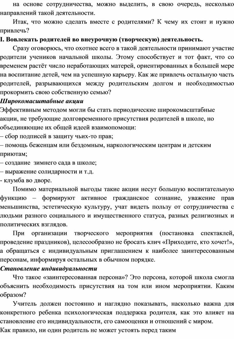 Принимая во внимание, что совместная деятельность с родителями строится на основе сотрудничества, можно выделить, в свою очередь, несколько направлений такой деятельности. Итак, что можно сделать вместе с родителями? К чему их стоит и нужно привлечь? I. Вовлекать родителей во внеурочную (творческую) деятельность. Сразу оговорюсь, что охотнее всего в такой деятельности принимают участие родители учеников начальной школы. Этому способствует и тот факт, что со временем растёт число неработающих матерей, ориентированных в большей мере на воспитание детей, чем на успешную карьеру. Как же привлечь остальную часть родителей, разрывающихся между родительским долгом и необходимостью прокормить свою собственную семью? Широкомасштабные акции Эффективным методом могли бы стать периодические