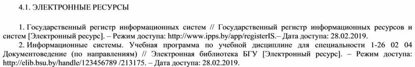 2. Информационные системы. Учебная программа по учебной дисциплине для специальности 1-26 02 04 Документоведение (по направлениям) // Электронная библиотека БГУ [Электронный ресурс]. – Режим доступа: http://elib.bsu.by/handle/123456789 /213175. – Дата доступа: 28.02.2019.
