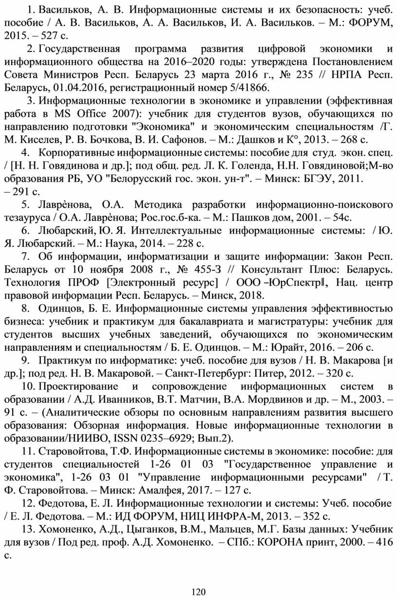 17. Старовойтова, Т.Ф. Информационные системы в экономике: пособие: для студентов специальностей 1-26 01 03 "Государственное управление и экономика", 1-26 03 01 "Управление информационными ресурсами" / Т. Ф. Старовойтова. – Минск: Амалфея, 2017. – 127 с.