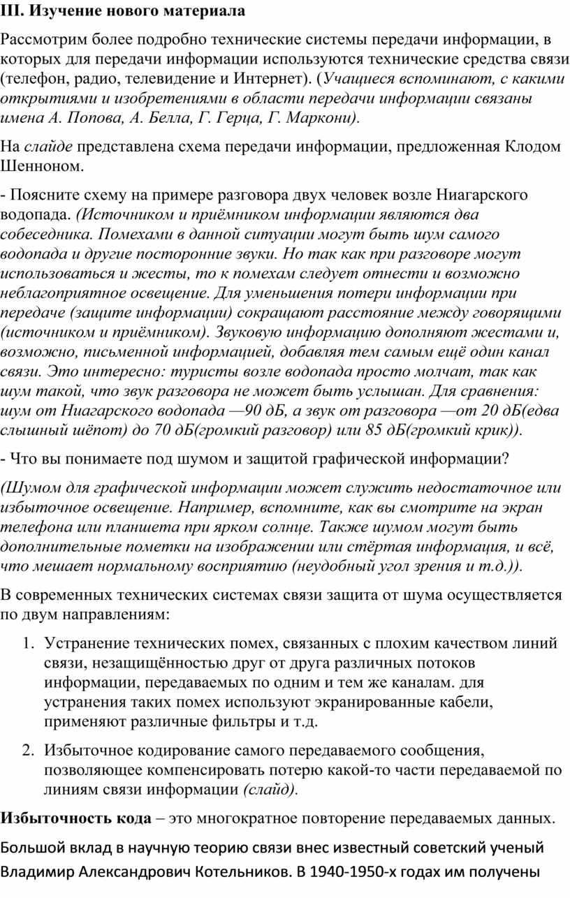 Большой вклад в научную теорию связи внес известный советский ученый Владимир Александрович Котельников. В 1940-1950-х годах им получены фундаментальные научные результаты по проблеме помехоустойчивости систем передачи информации (сообщение ученика).