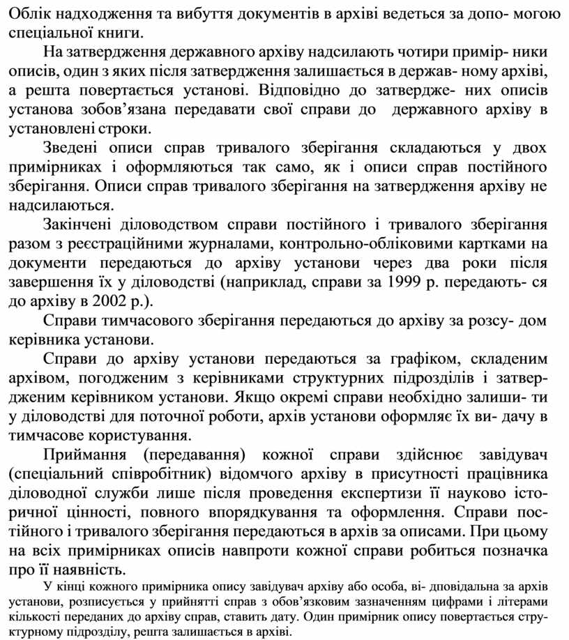 Перед передачею документів до архіву перевіряються і уточню- ються терміни їх зберігання. Архів приймає документи згідно з опи- сом.