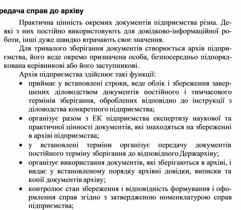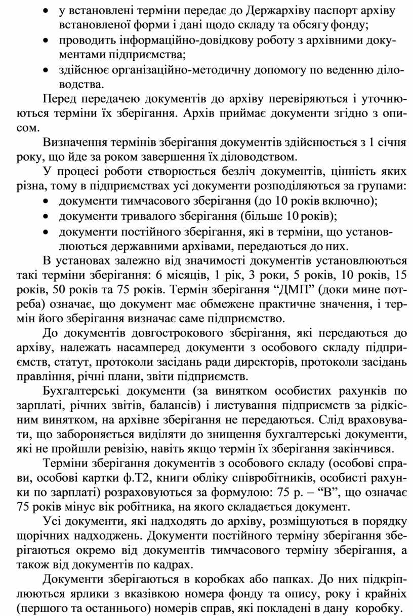 Для тривалого зберігання документів створюється архів підпри- ємства, його веде окремо призначена особа, безпосередньо підпоряд- кована керівникові або його заступникові.