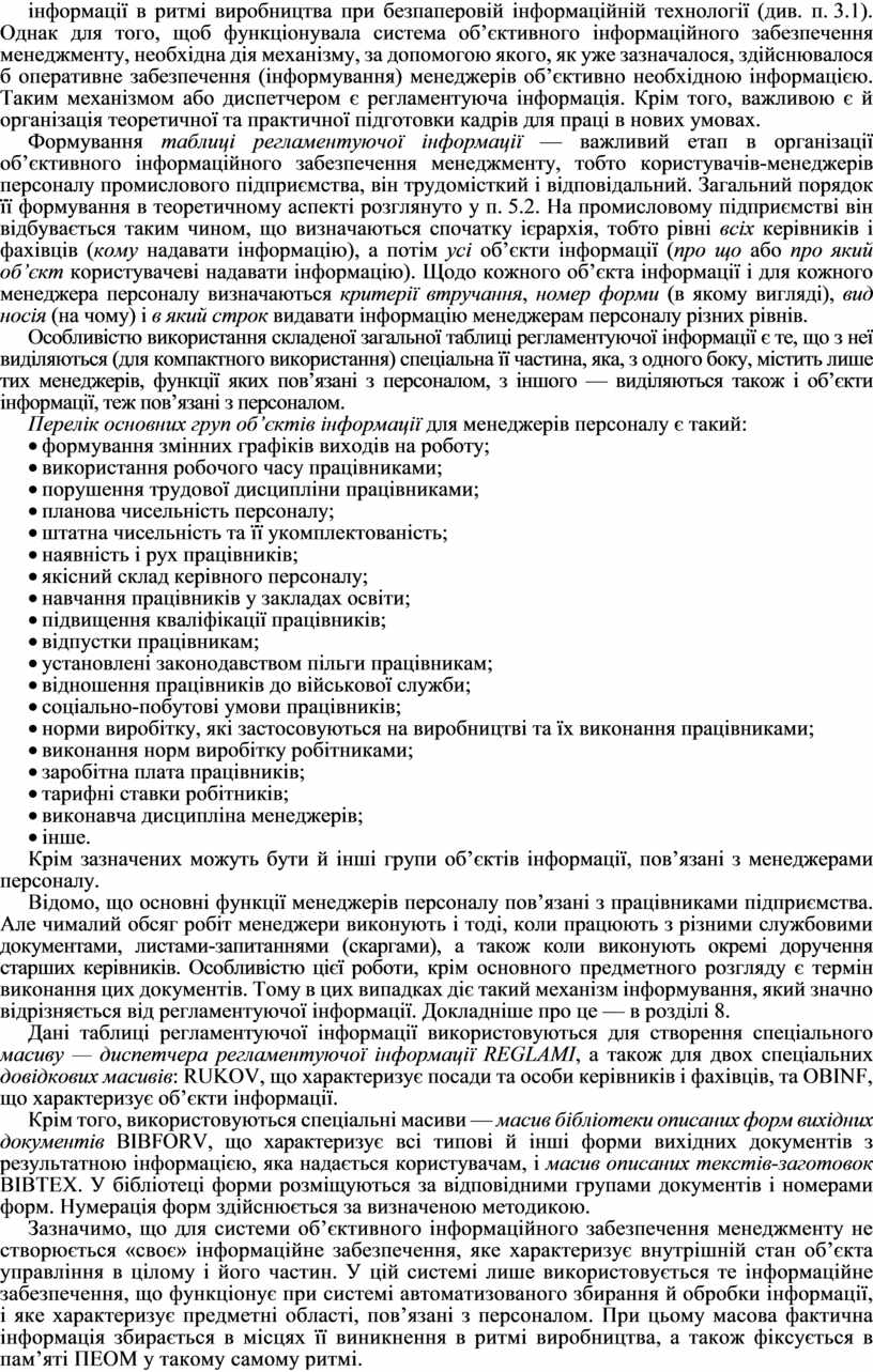 Такою підсистемою є і система об’єктивного інформаційного забезпечення менеджменту, яка входить як складова частина в систему автоматизованого збирання та обробки інформації на промисловому підприємстві, і в якій використовуються комплекси АРМ для збирання інформації в ритмі виробництва при безпаперовій інформаційній технології (див. п. 3.1). Однак для того, щоб функціонувала система об’єктивного інформаційного забезпечення менеджменту, необхідна дія механізму, за допомогою якого, як уже зазначалося, здійснювалося б оперативне забезпечення (інформування) менеджерів об’єктивно необхідною інформацією. Таким механізмом або диспетчером є регламентуюча інформація. Крім того, важливою є й організація теоретичної та практичної підготовки кадрів для праці в нових умовах.