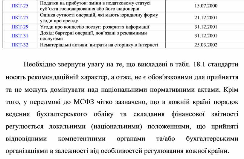 Необхідно звернути увагу на те, що викладені в табл. 18.1 стандарти носять рекомендаційній характер, а отже, не є обов¢язковими для прийняття та не можуть домінувати над національними нормативними актами. Крім того, у передмові до МСФЗ чітко зазначено, що в кожній країні порядок ведення бухгалтерського обліку та складання фінансової звітності регулюється локальними (національними) положеннями, що прийняті відповідними компетентними органами та/або бухгалтерськими організаціями в залежності від особливостей регулювання кожної країни.