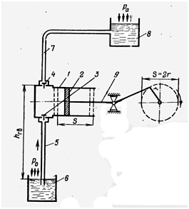 Розглянемо схему насосної установки, представленої на рис. 2.20. Приймемо, що р0 - тиск у витратній ємності 1, з якої насосом 2 засмоктується рідина; p2 - тиск у напірній ємності 3; рвс - тиск у всмоктувальному патрубку насоса; рн - тиск у напірному патрубку насоса; Hвс - висота всмоктування; Hн - висота нагнітання; Hг - геометрична висота подачі рідини; h - відстань по вертикалі між рівнями установки манометра М і вакуумметра В.