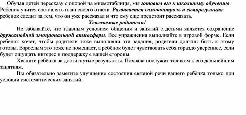 Обучая детей пересказу с опорой на мнемотаблицы, мы готовим его к школьному обучению. Ребенок учится составлять план своего ответа. Развивается самоконтроль и саморегуляция: ребенок следит за тем, что он уже рассказал и что ему еще предстоит рассказать.