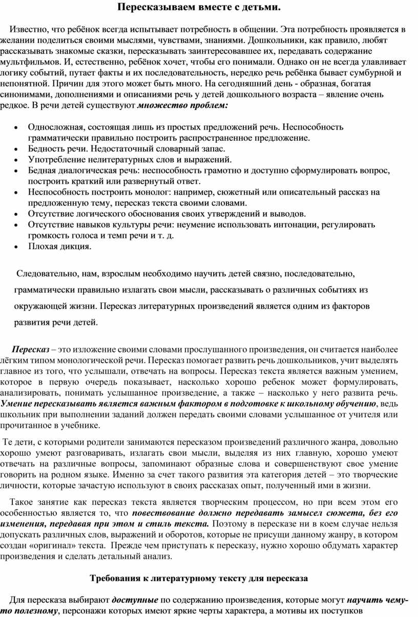 Требования к литературному тексту для пересказа