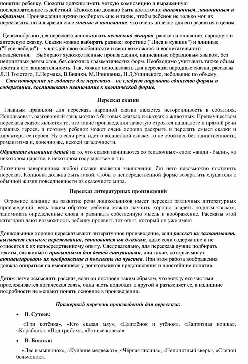 Огромное влияние на развитие речи дошкольников имеет пересказ различных литературных произведений, ведь таким образом ребенка можно научить хорошо владеть родным языком, запоминать определенные слова и развивать собственную мысль и воображение. Рассказы этой категории дают возможность ребенку проявить тот опыт, который он уже имеет.