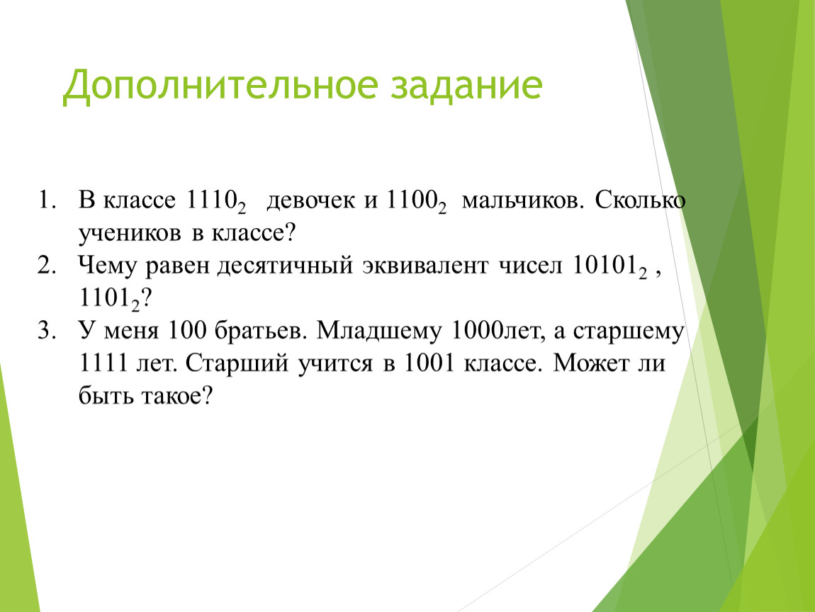 3. У меня 100 братьев. Младшему 1000лет, а старшему 1111 лет. Старший учится в 1001 классе. Может ли быть такое?