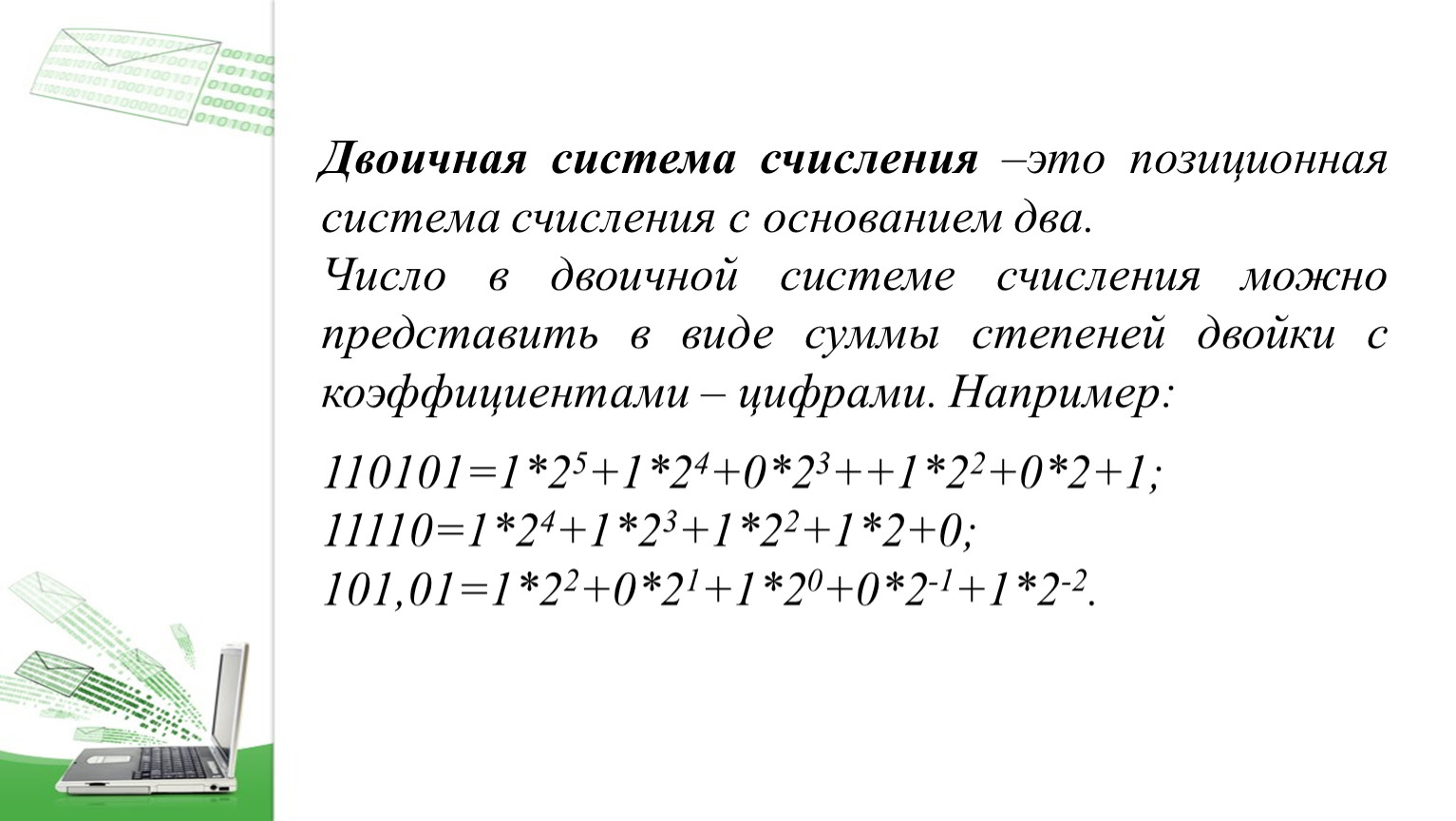 Число в двоичной системе счисления можно представить в виде суммы степеней двойки с коэффициентами – цифрами. Например: