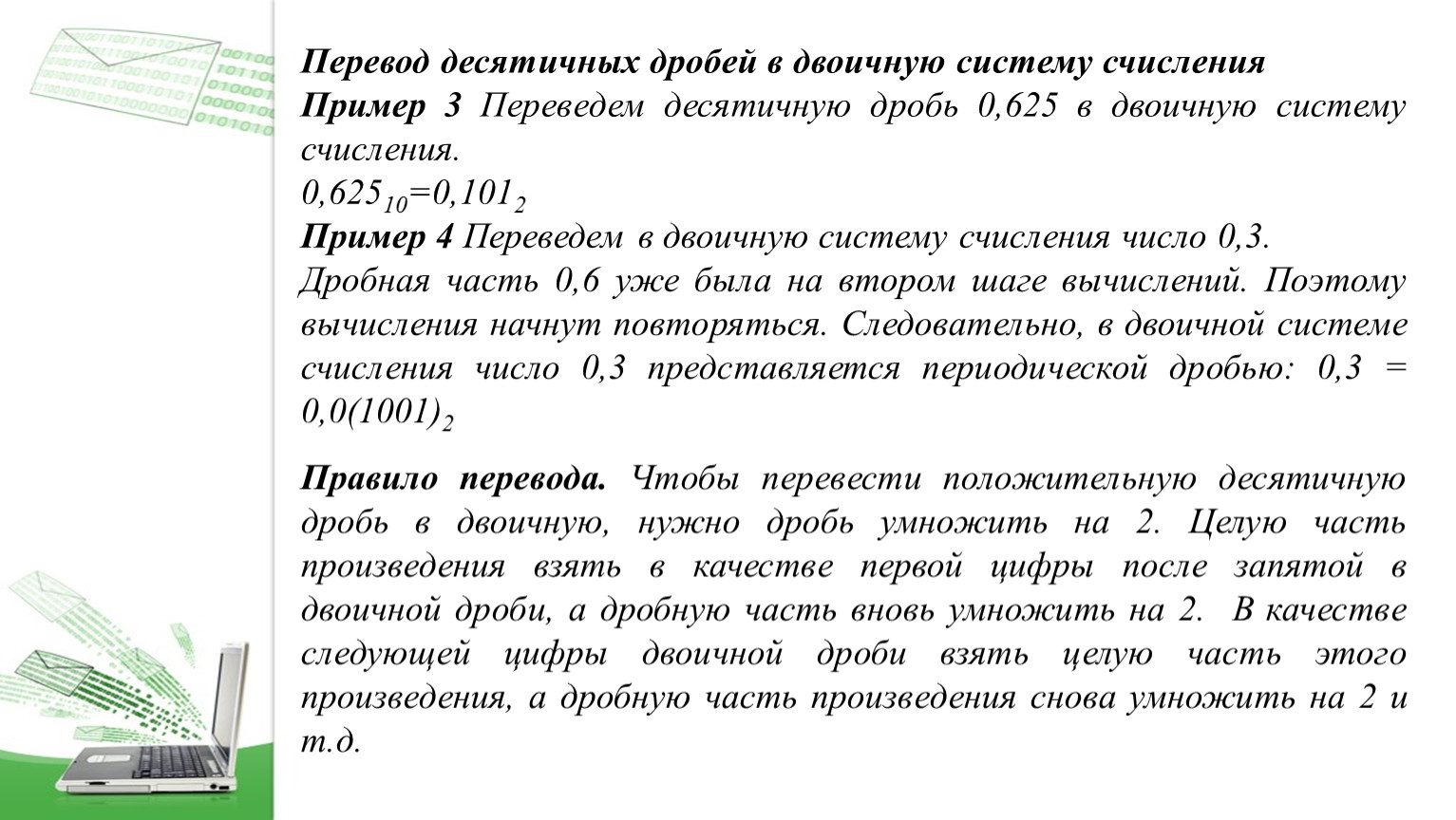 Правило перевода. Чтобы перевести положительную десятичную дробь в двоичную, нужно дробь умножить на 2. Целую часть произведения взять в качестве первой цифры после запятой в двоичной дроби, а дробную часть вновь умножить на 2. В качестве следующей цифры двоичной дроби взять целую часть этого произведения, а дробную часть произведения снова умножить на 2 и т.д.