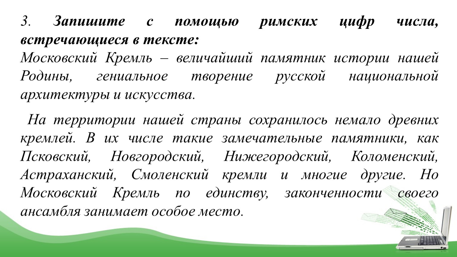 3. Запишите с помощью римских цифр числа, встречающиеся в тексте:
