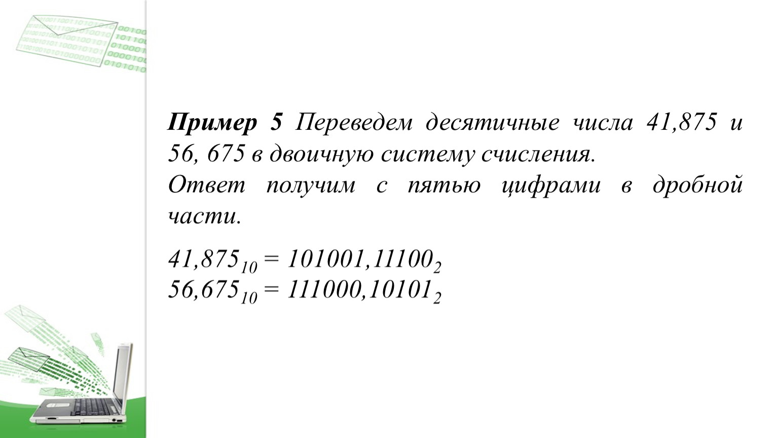 Пример 5 Переведем десятичные числа 41,875 и 56, 675 в двоичную систему счисления.