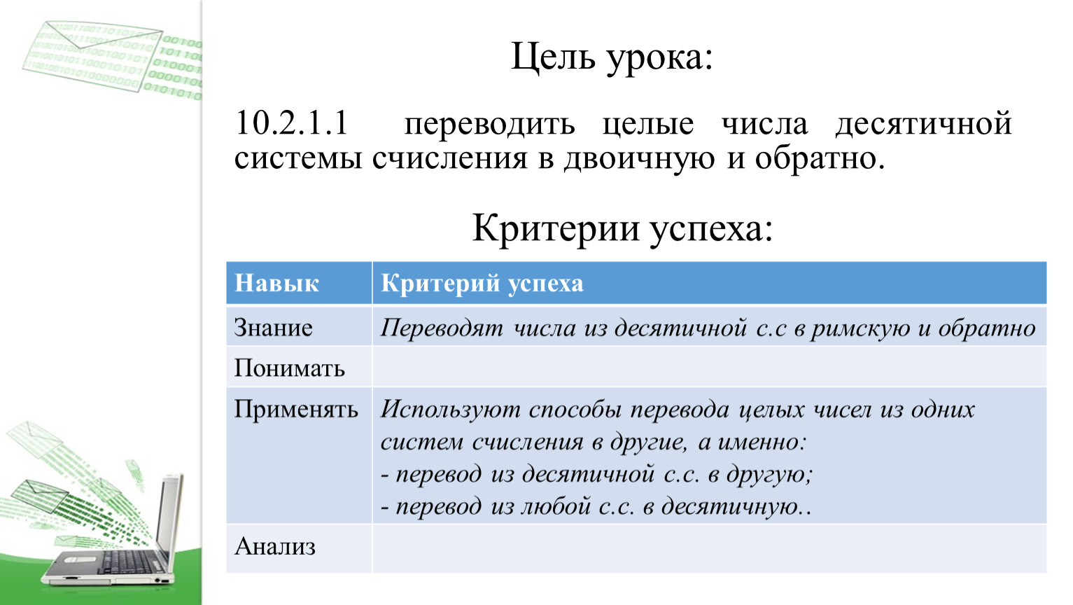 10.2.1.1 переводить целые числа десятичной системы счисления в двоичную и обратно.